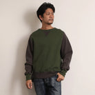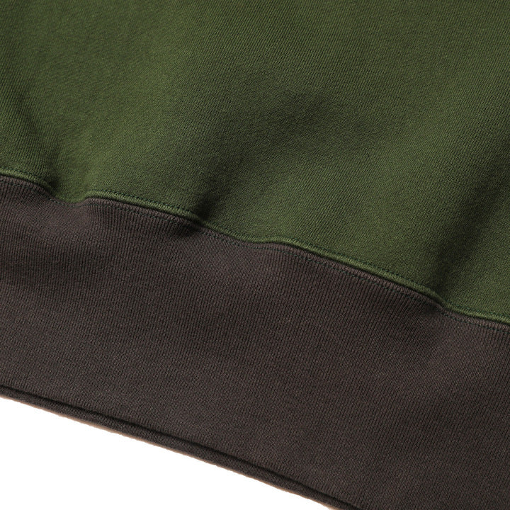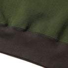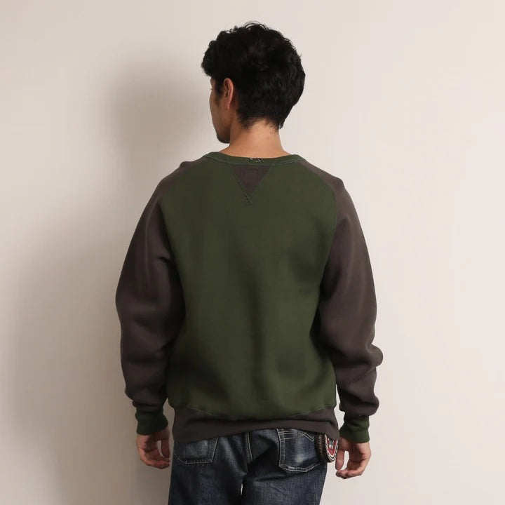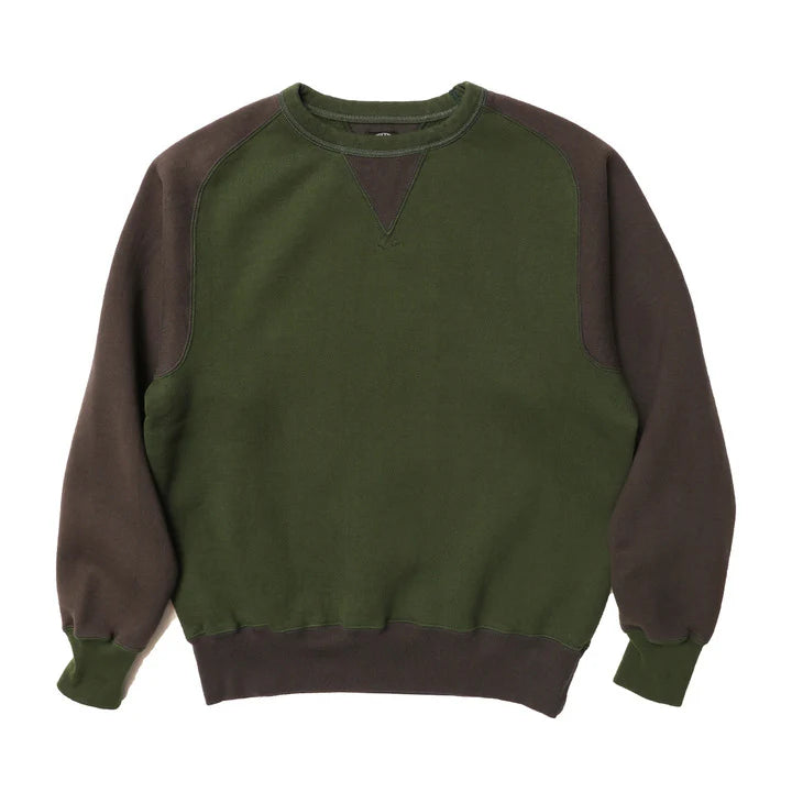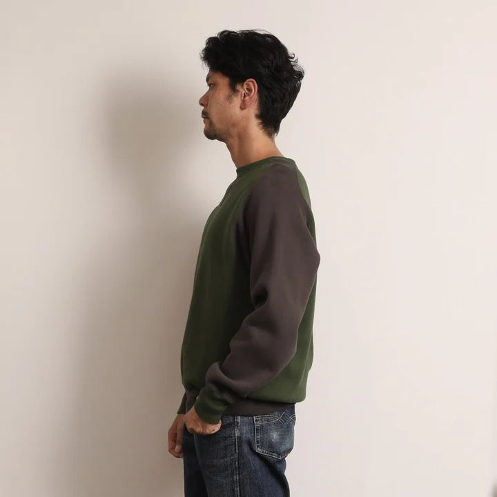 The JELADO Champs 2 Tone Sweat Shirt draws inspiration from our vintage sweatshirt collection, featuring a fresh two-tone design in grass green and smoke black, including a reversed color variant. Crafted using the rare Azuma knitting machine, it is knitted in a seamless round-body style, delivering exceptional softness, elasticity, and a distinctive plump texture. This vintage-style fabric boasts a unique surface with subtle unevenness, achieved through a meticulous four-sided brushing process before dyeing. The garment is finished with expert two-needle stitching and vintage-accurate round-knit ribbed cuffs, embodying authentic craftsmanship and timeless style.