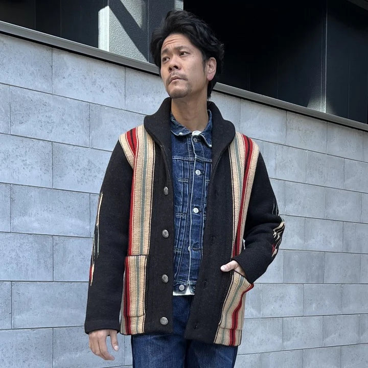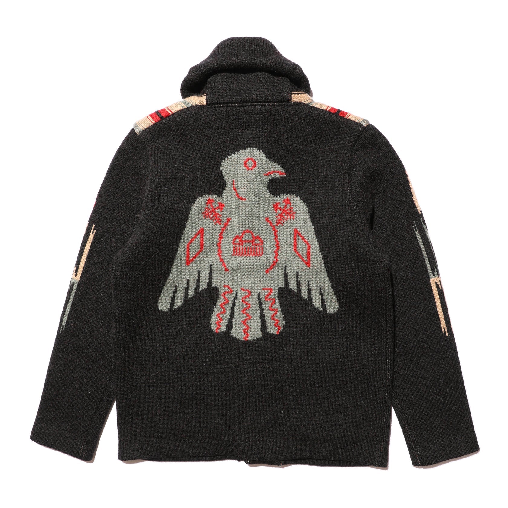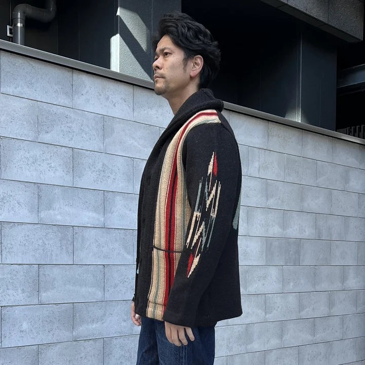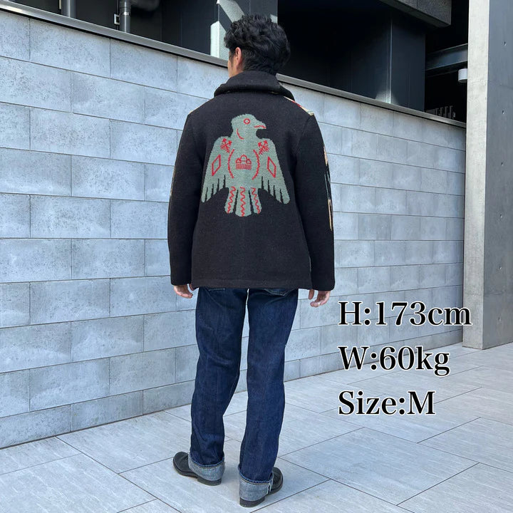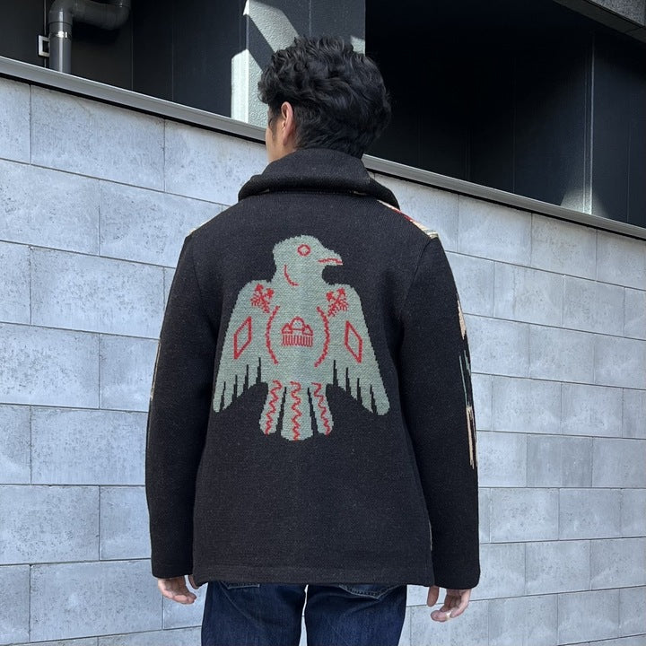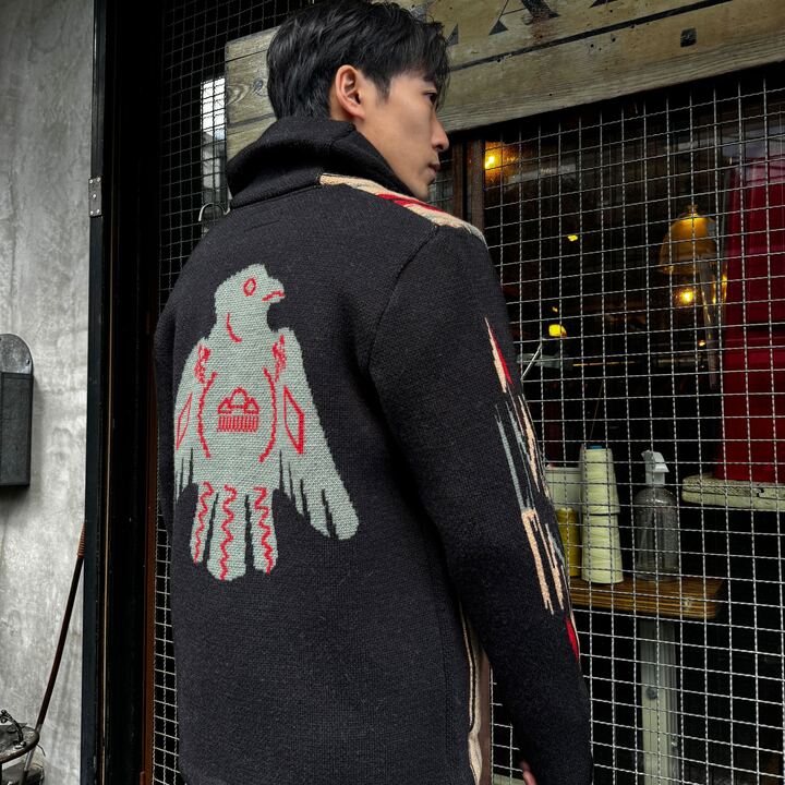 Introducing JELADO Lagna Black, inspired by the 2024 theme "SPROUT". This reissued LAGUNA knit cardigan features a bold Thunderbird design on the back and a multi-colored striped pattern on the front, enhanced with native-inspired metal buttons. Crafted with high-quality Merino wool and expertly woven, this heavy 5-gauge cardigan offers both style and comfort.
