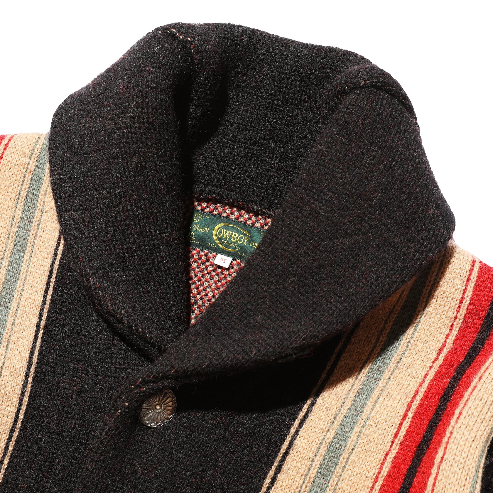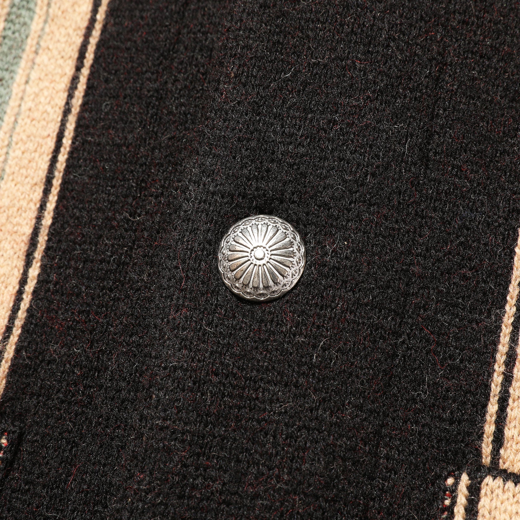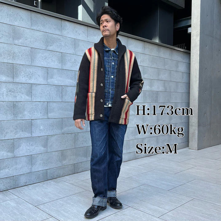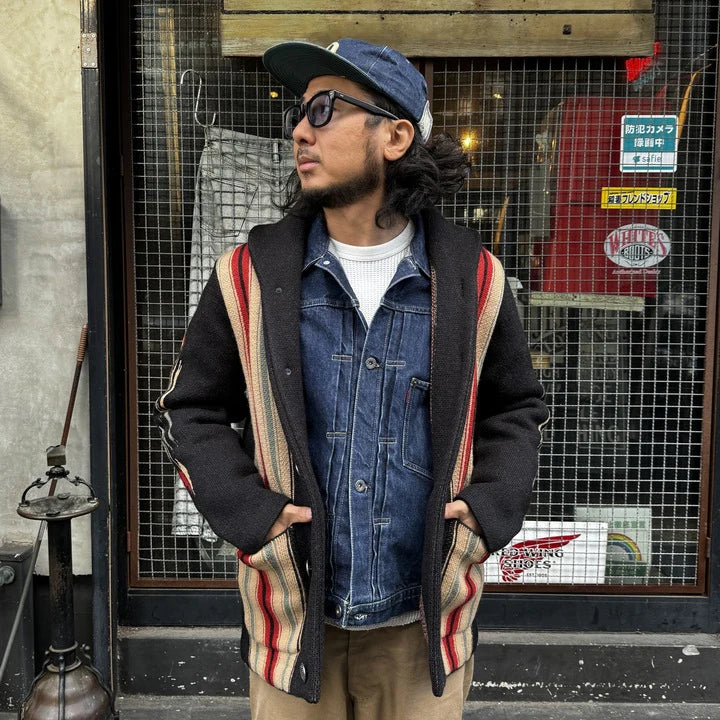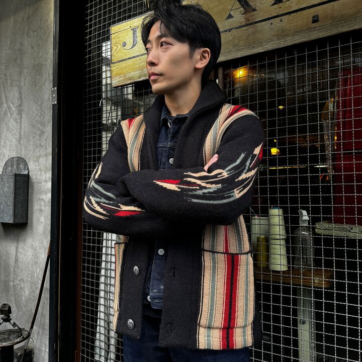 Introducing JELADO Lagna Black, inspired by the 2024 theme "SPROUT". This reissued LAGUNA knit cardigan features a bold Thunderbird design on the back and a multi-colored striped pattern on the front, enhanced with native-inspired metal buttons. Crafted with high-quality Merino wool and expertly woven, this heavy 5-gauge cardigan offers both style and comfort.