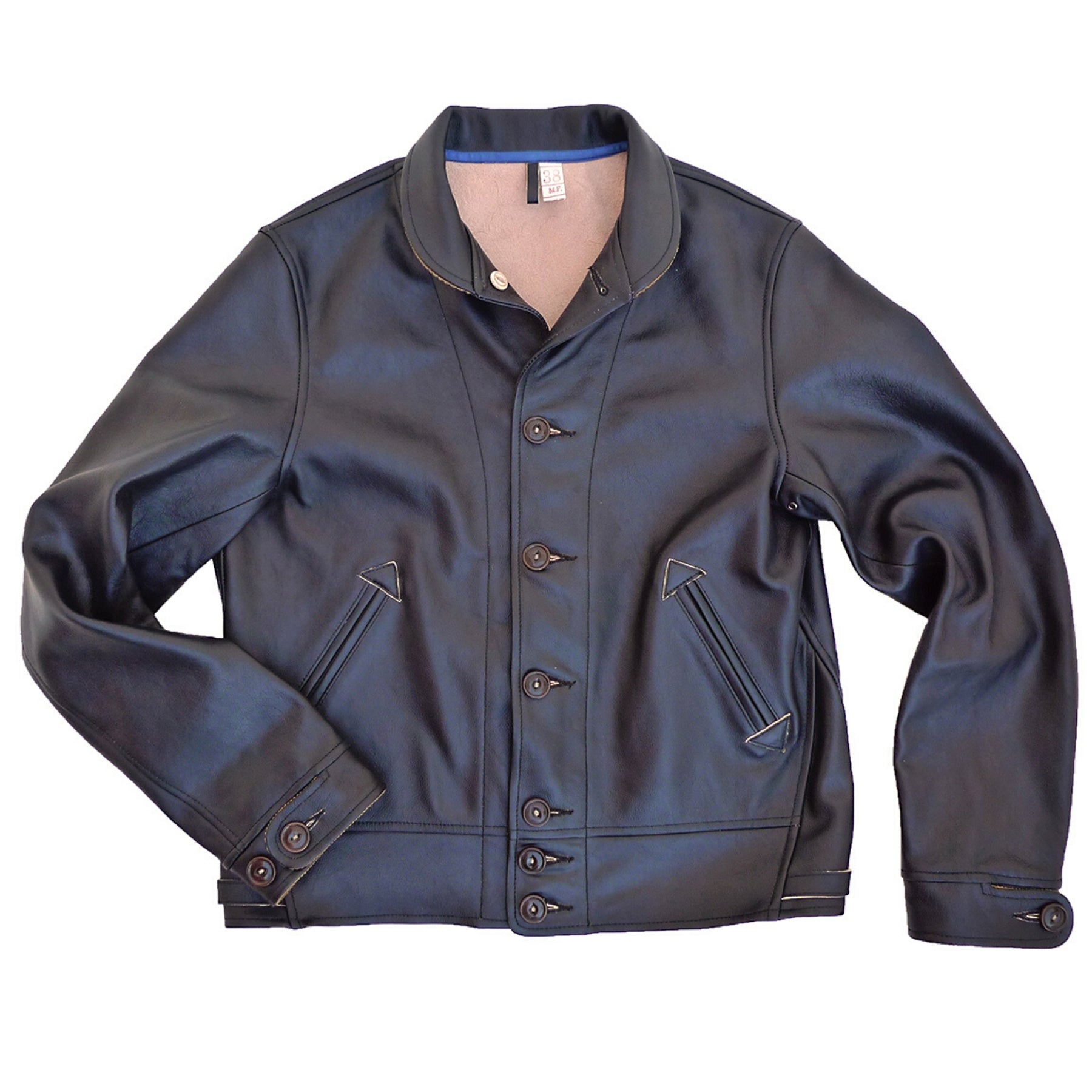 The MF® “STALLION” Campus Jacket in black veg-tan ’Tea-core” cowhide leather is designed and made in California by Mister Freedom®.