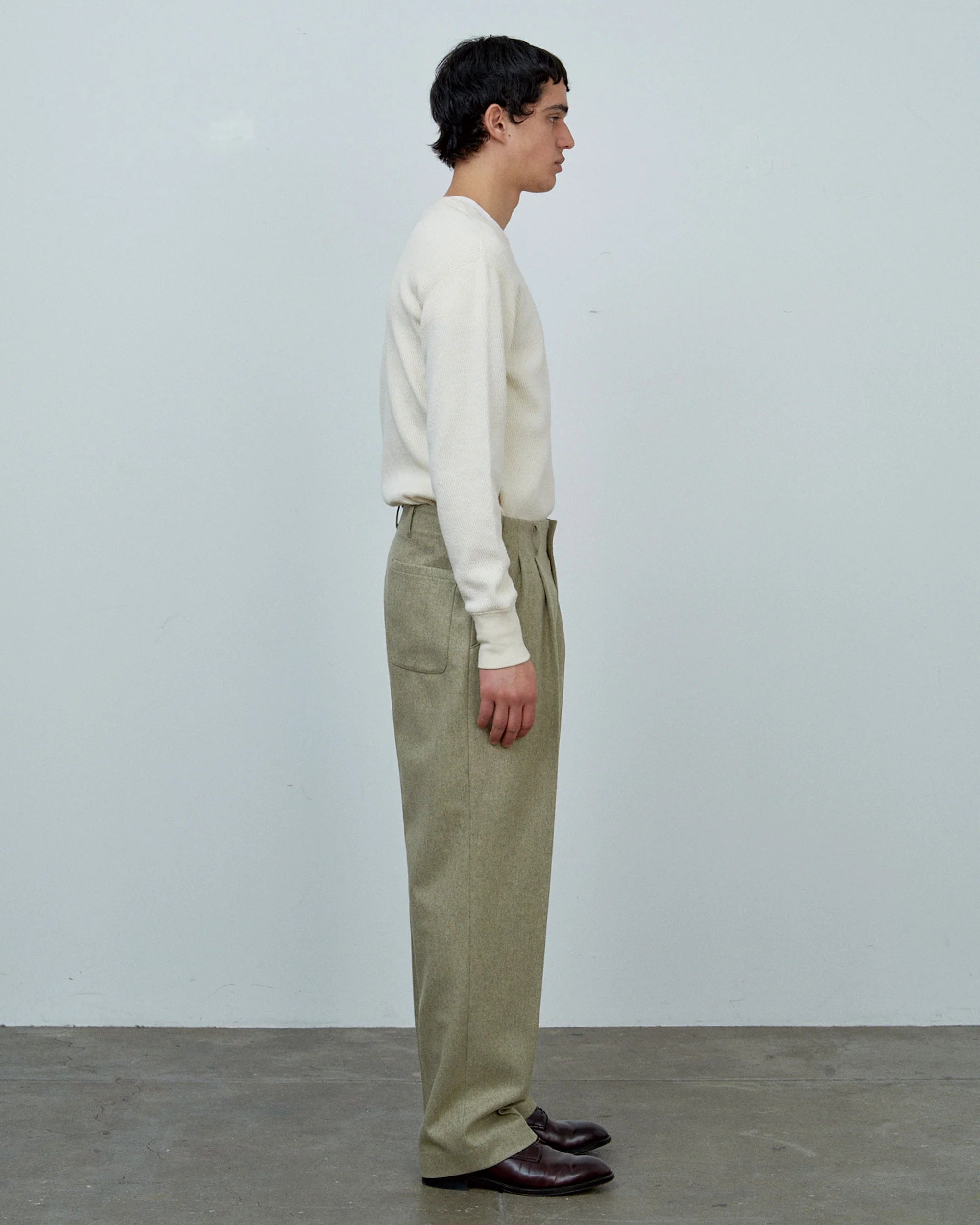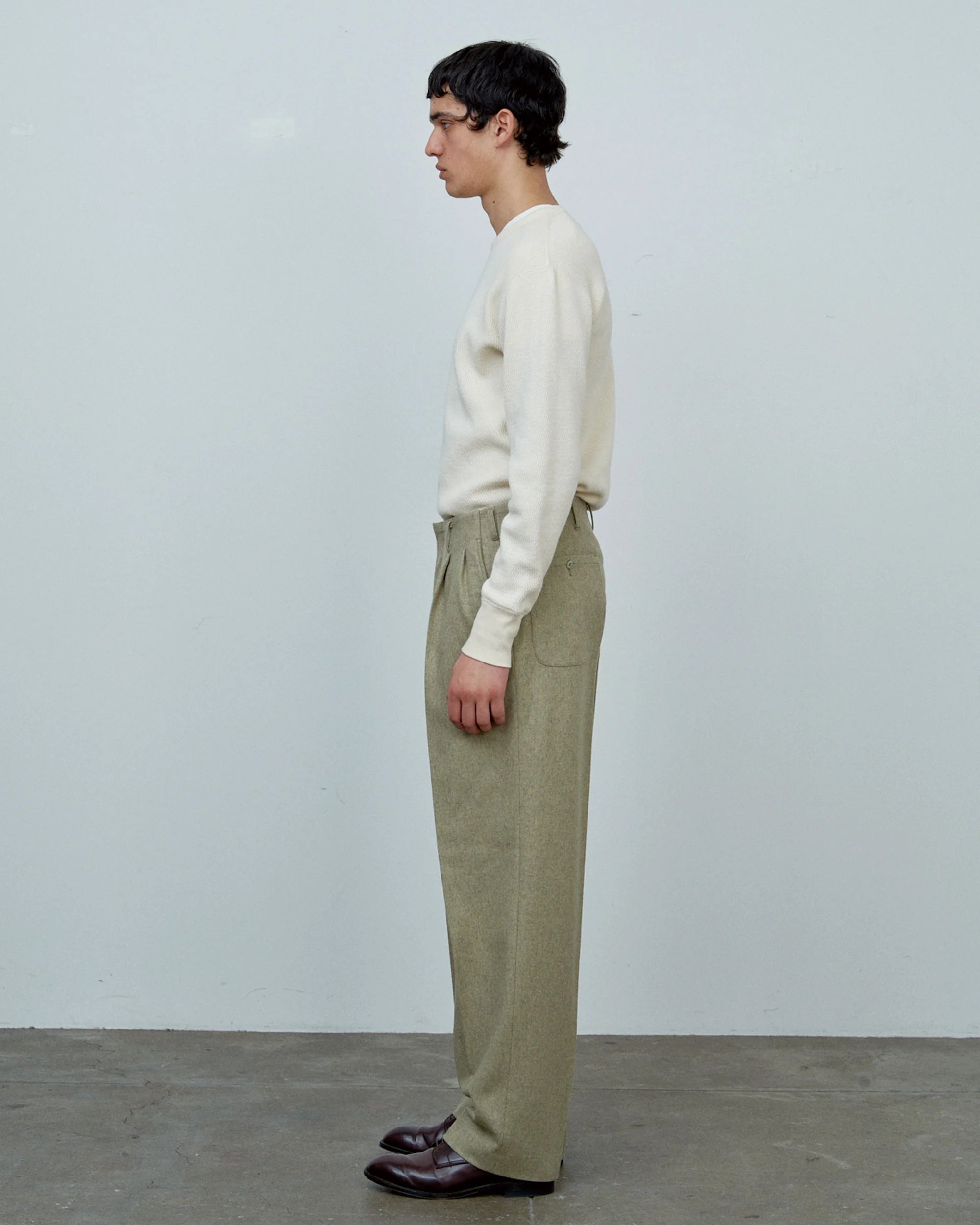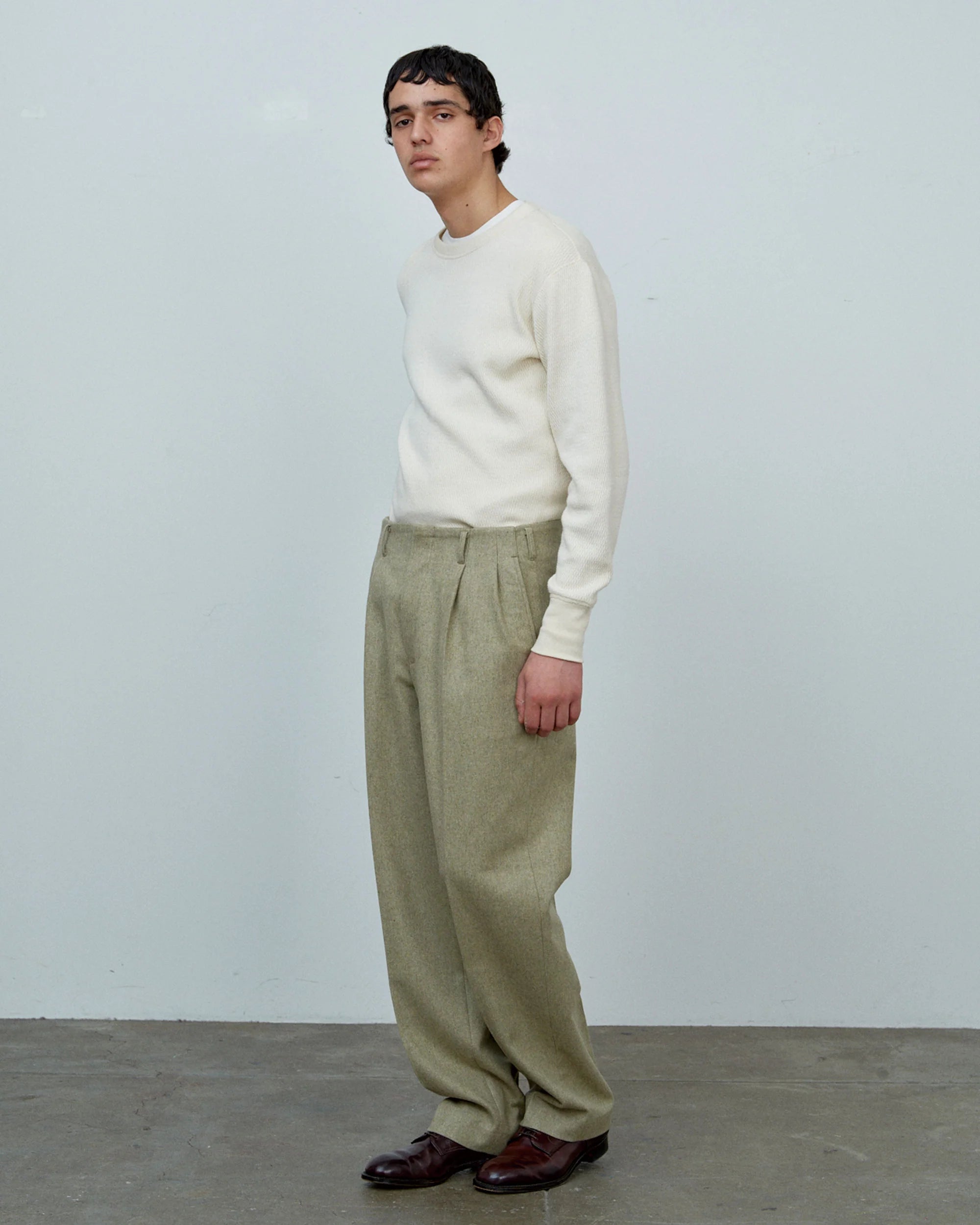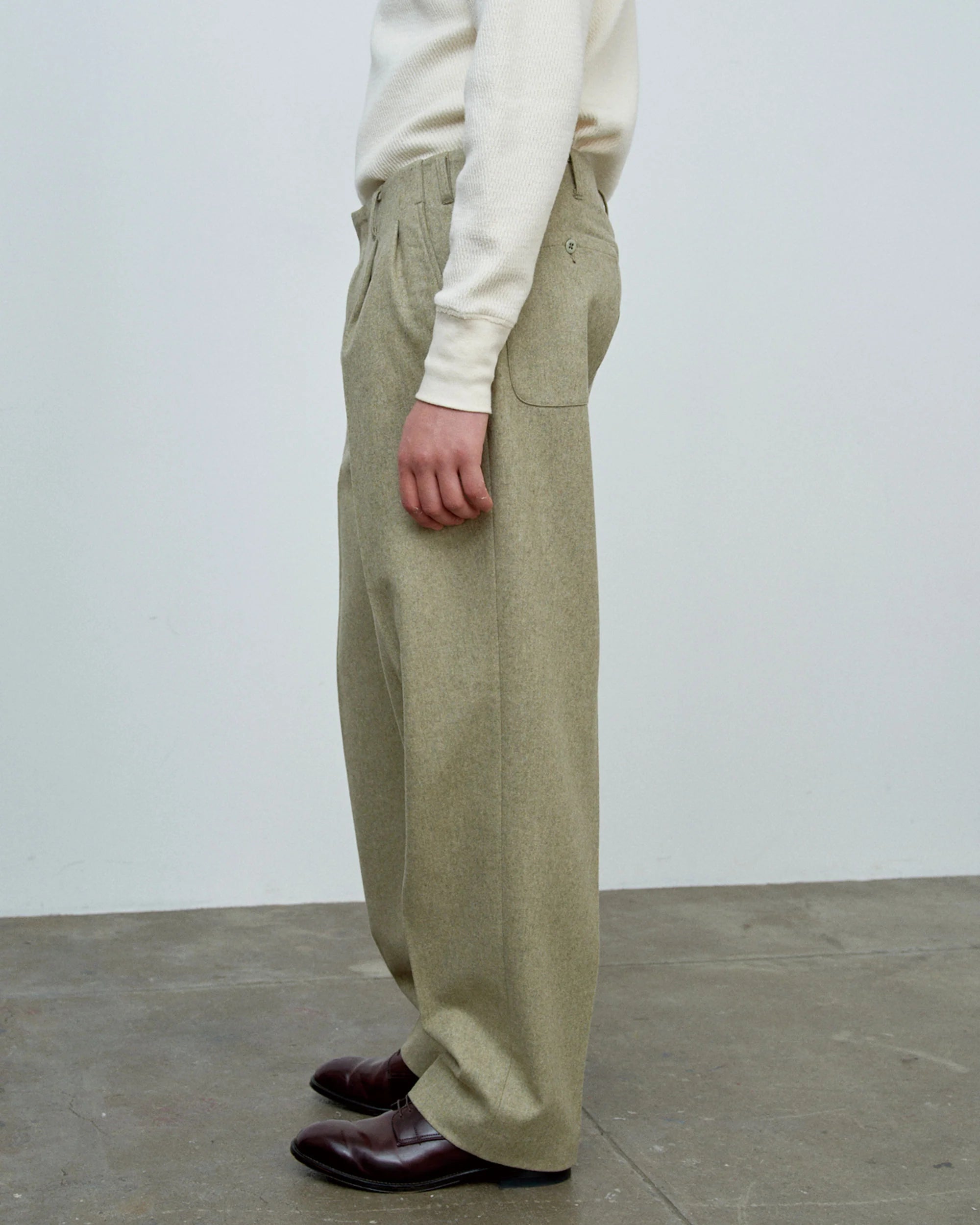 Authentic 1950s workwear styling meets everyday versatility in these Big Yank pegtop wool flannel trousers. Crafted in the era's denim factories, they embody the minimalist design philosophy of classic Hollywood pants—no unnecessary embellishments, just purposeful construction. The warm wool flannel delivers a soft hand and exceptional comfort, while the signature pegtop silhouette tapers elegantly toward the hem, showcasing the functional beauty inherent to vintage workwear. A timeless piece that captures mid-century character without compromising modern wearability.