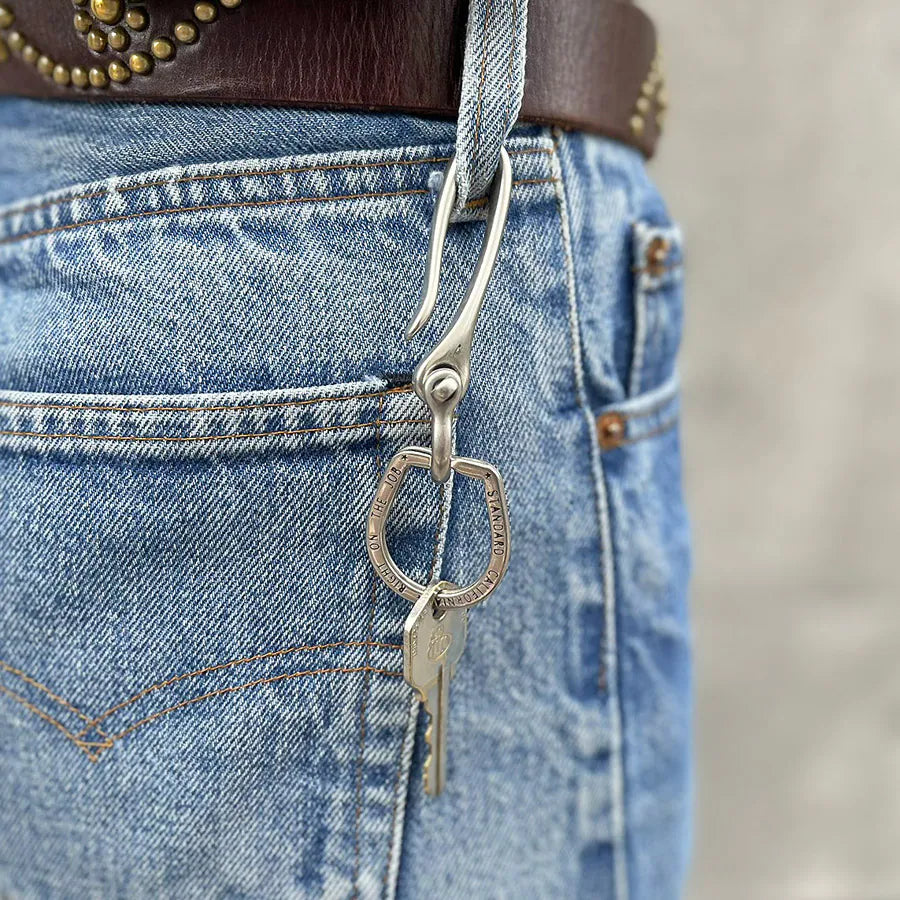 Standard California's Button Works keychain merges functional design with artisanal craftsmanship. Featuring an original brass fishing hook paired with a detachable shackle and SD original double ring, this piece is engineered for everyday carry. The silver finish employs a specialised plating technique that resists gloss, developing a refined patina over time, whilst the glossy brass plating ages beautifully with use. Approximately 10cm in length and crafted entirely from brass, this keychain rewards regular handling with character and depth. Minor ring openings may occur during production—all items are quality-inspected before dispatch.