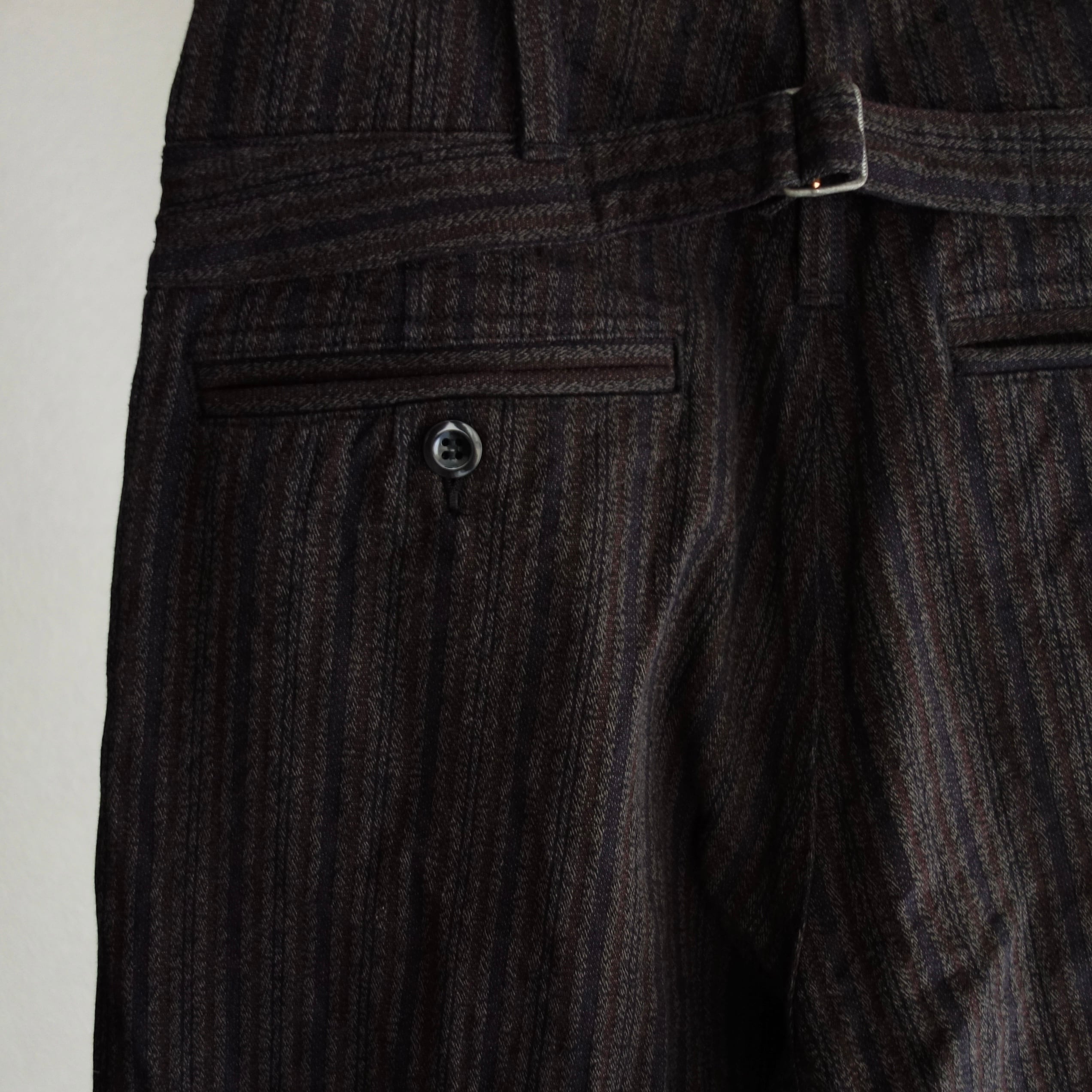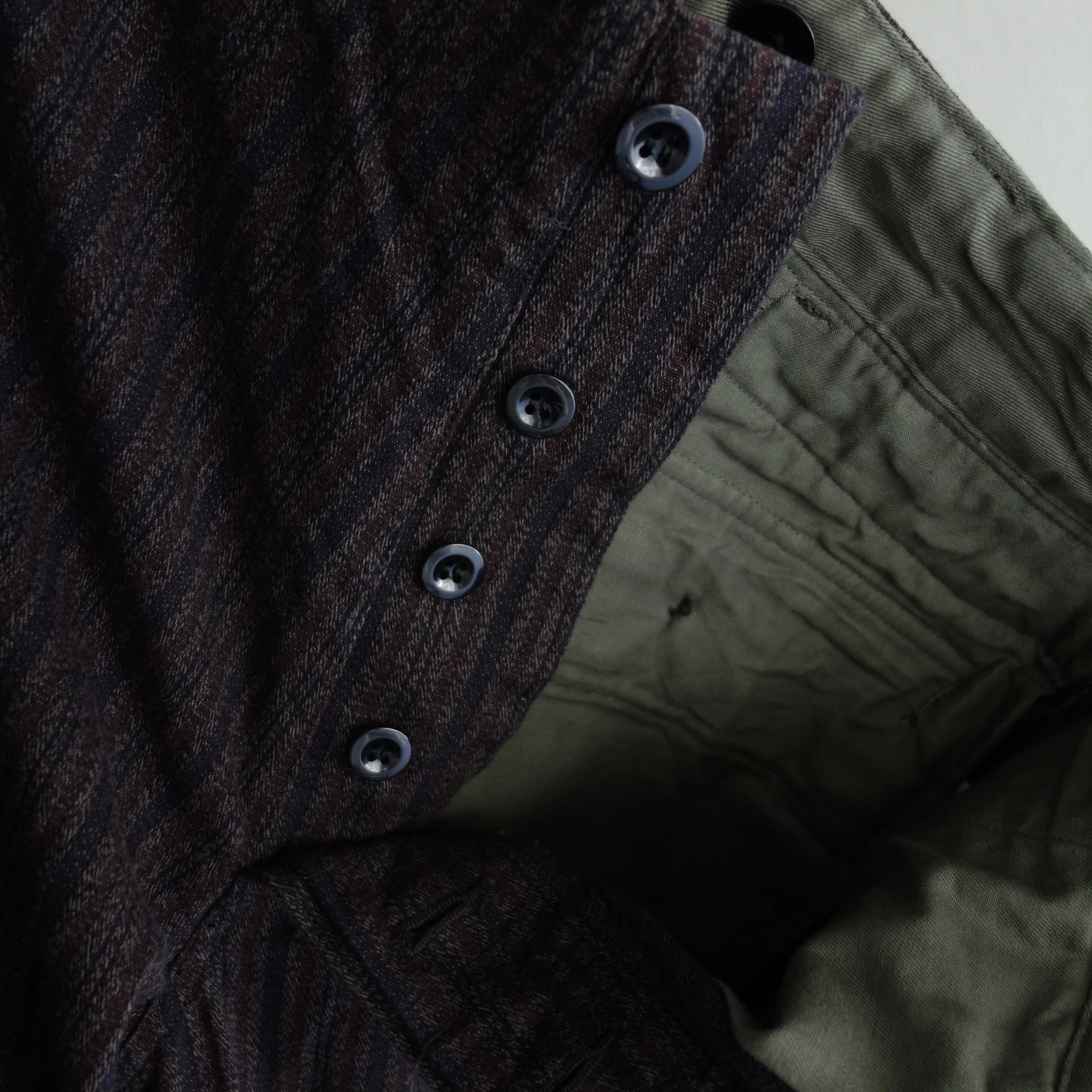 These ATELIER GARDENIA "FRENCHFARMERS" wide pants feature a sturdy dobby stripe fabric made by twisting two or more threads of 16-gauge yarn in different colors. Handwoven on a dobby loom, these pants have a rich, subdued appearance. With a updated pattern and improved silhouette, these pants offer a wide and comfortable fit without sacrificing refinement. Versatile and stylish, these pants are perfect for any occasion.