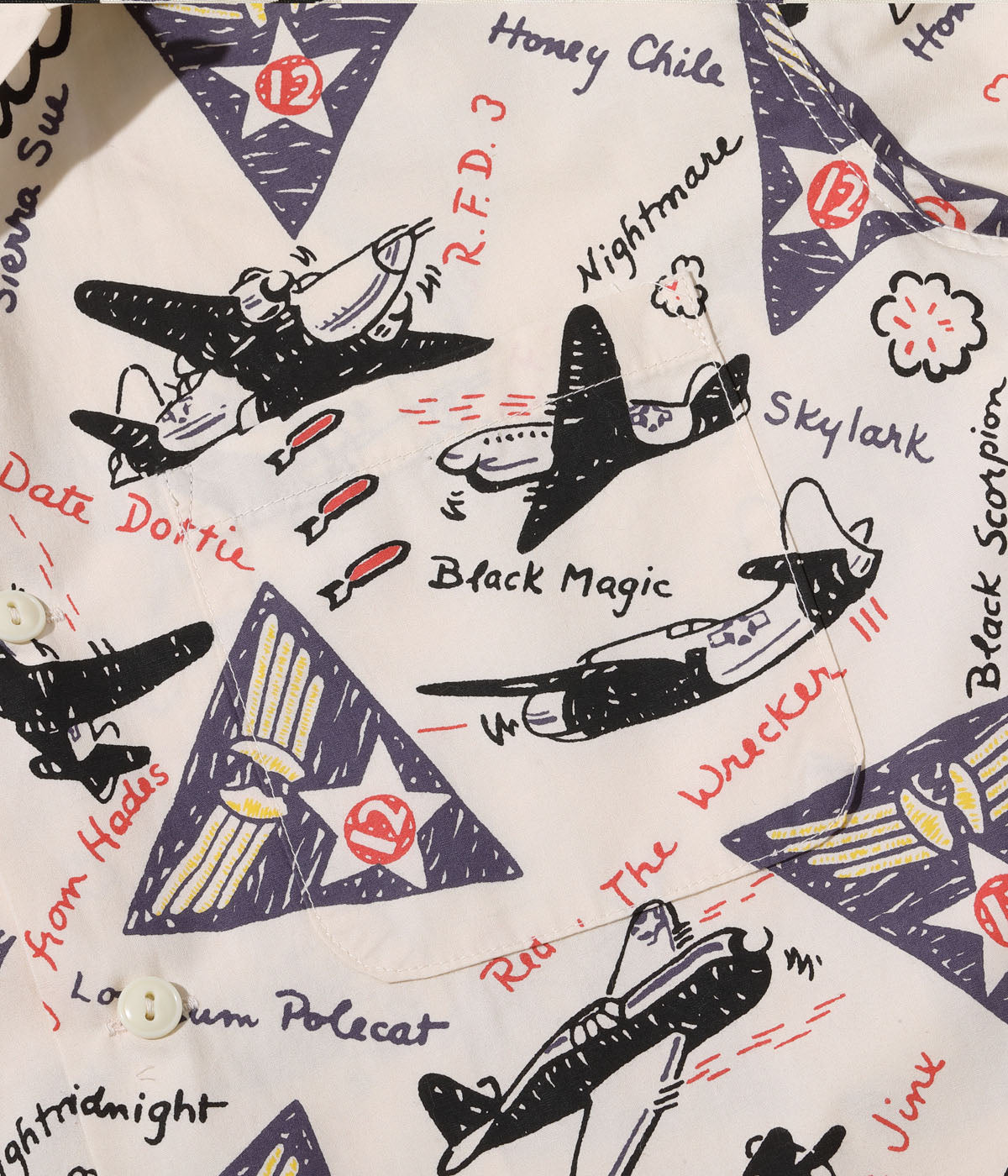 Introducing the Buzz Ricksons TWELFTH AIR FORCE PRINT SHIRT, a rare and valuable reproduction of a vintage military-themed shirt. Its all-over print features the fighter and bomber planes used by the 12th Air Force, with details inspired by authentic nose art titles. A must-have for military and vintage enthusiasts.