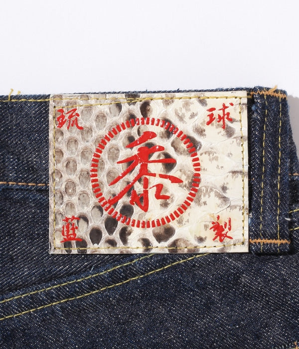 The Sugar Cane Fiber denim Lot. 301 is woven with the original yarns blended with 50% cotton and 50% sugar cane fiber. Ryukyu-Ai indigo from Okinawa and regular indigo are combined and resulted in the dark, reddish blue denim. The patch is made of python leather, and the logo is painted in lacquer. The silhouette is regular straight, similar to our 1947 model.