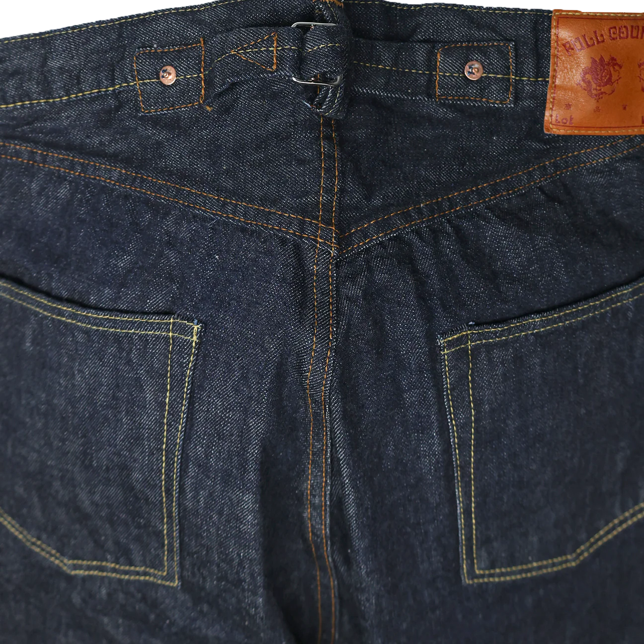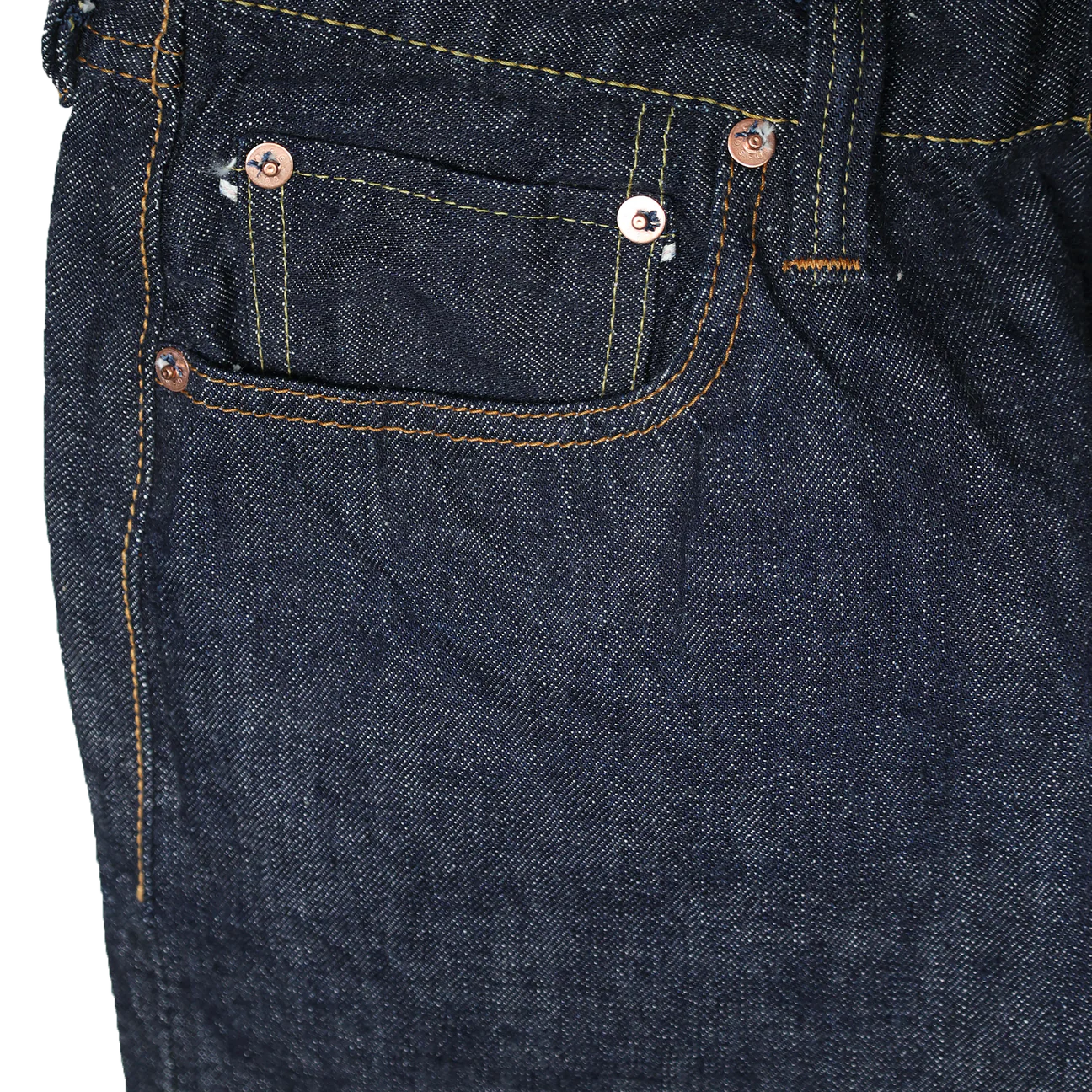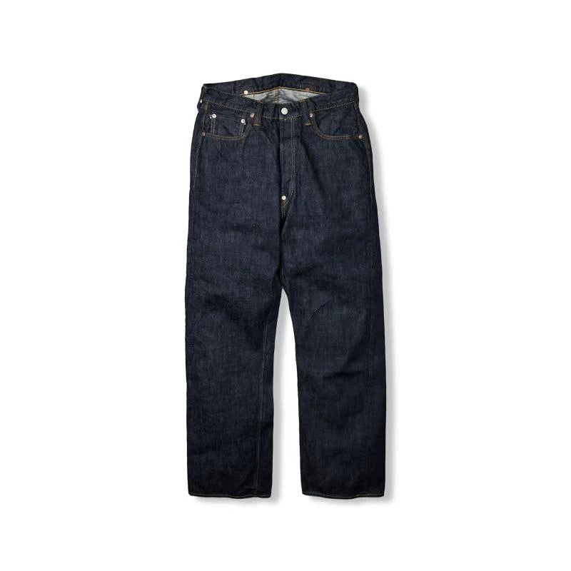 This model is from an era when jeans were held up by suspenders. The majority of people shifted to wearing belts however with the advent of the automobile (the hidden rivets scratched the seats), so suspender buttons were abolished and hidden rivets came into use. These are full of details that enthusiasts will love, such as the back strap with pronged buckle, the high yoke with rolled stitching, and the bar tacked back center belt loop. The new yellow stitching created specially for this model uses a dye that changes with the fading of the denim.