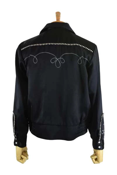 Our Dry Bones Western Style Satin Jacket is designed based on the classic western gabardine jacket that was popular in the 1950s. Crafted with care from rayon gabardine, this jacket combines influences from rock n' roll and western hillbilly music with the luxury of artificial silk. Enjoy a classic look that speaks to America's post-war wealth.