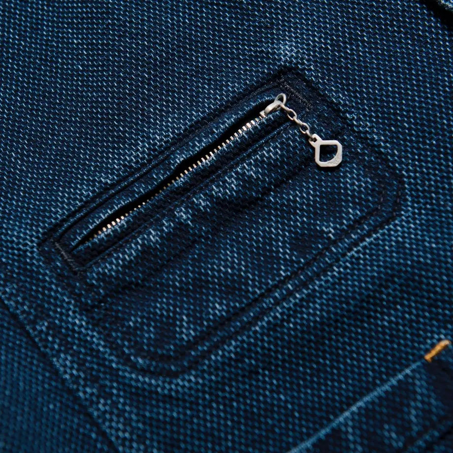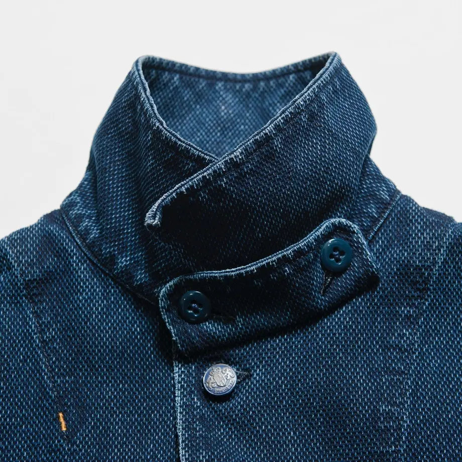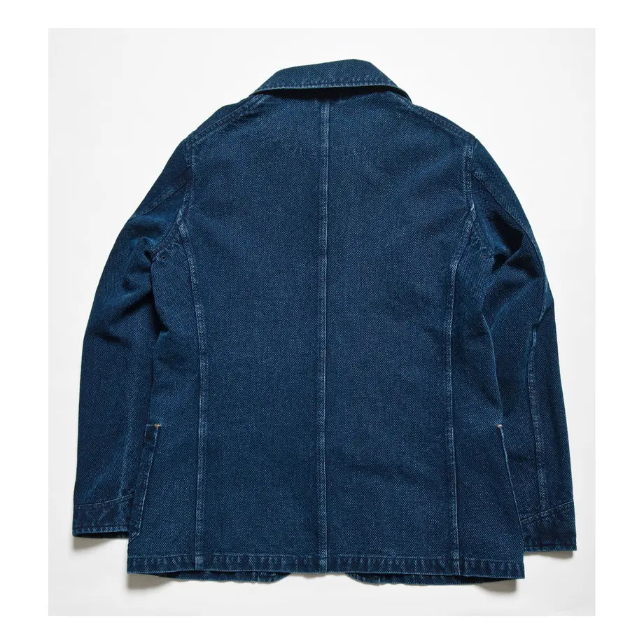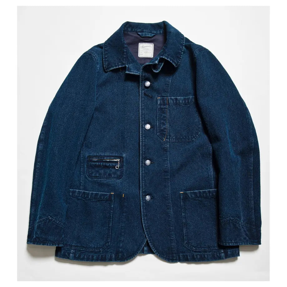 The Soundman Birmingham jacket in 2024 features a timeless design inspired by a fictional British steel mill uniform. The tailored pattern allows for versatile styling, complemented by the indigo-dyed sashiko fabric and ball bio-processing. The original metal change buttons and special aging technique add a unique touch. Complete the look with the matching Moorgate 174M-655 trousers in the same fabric.
