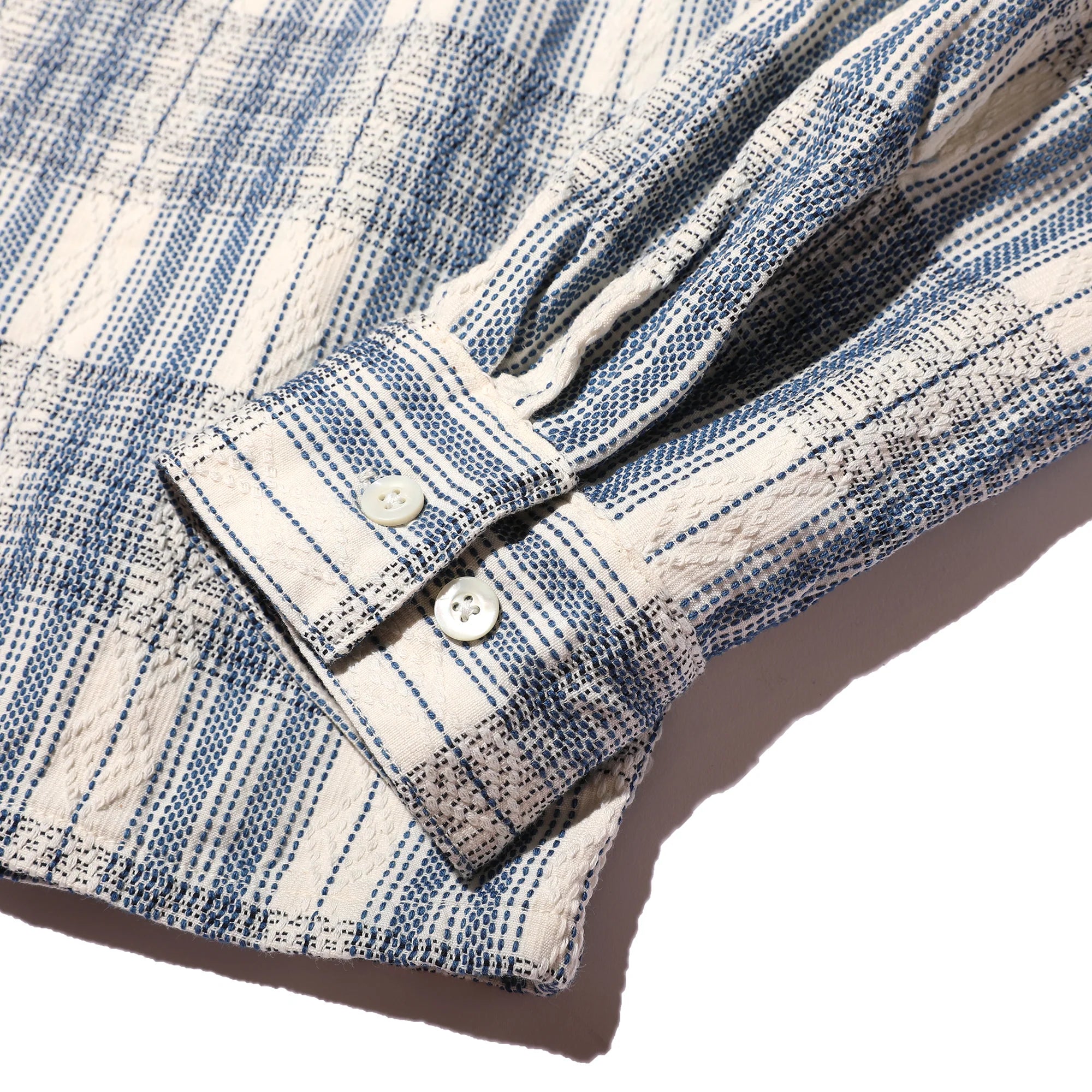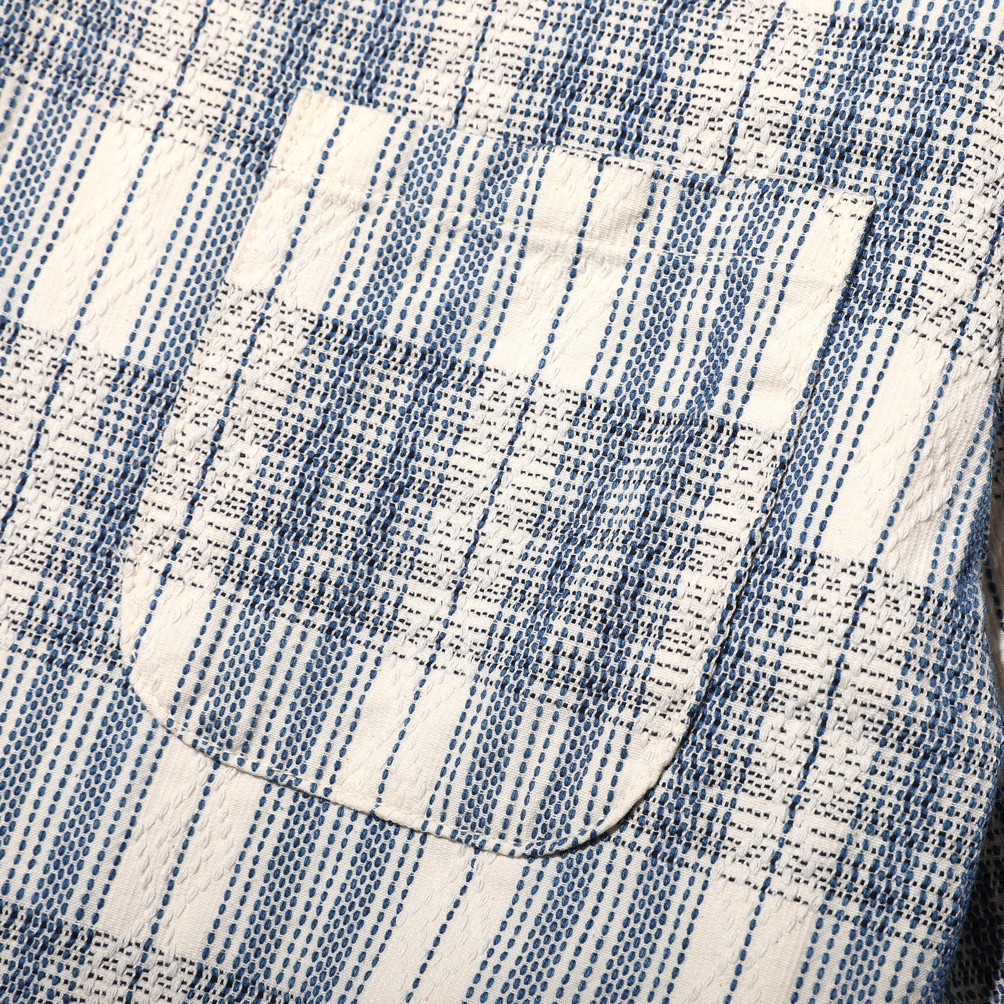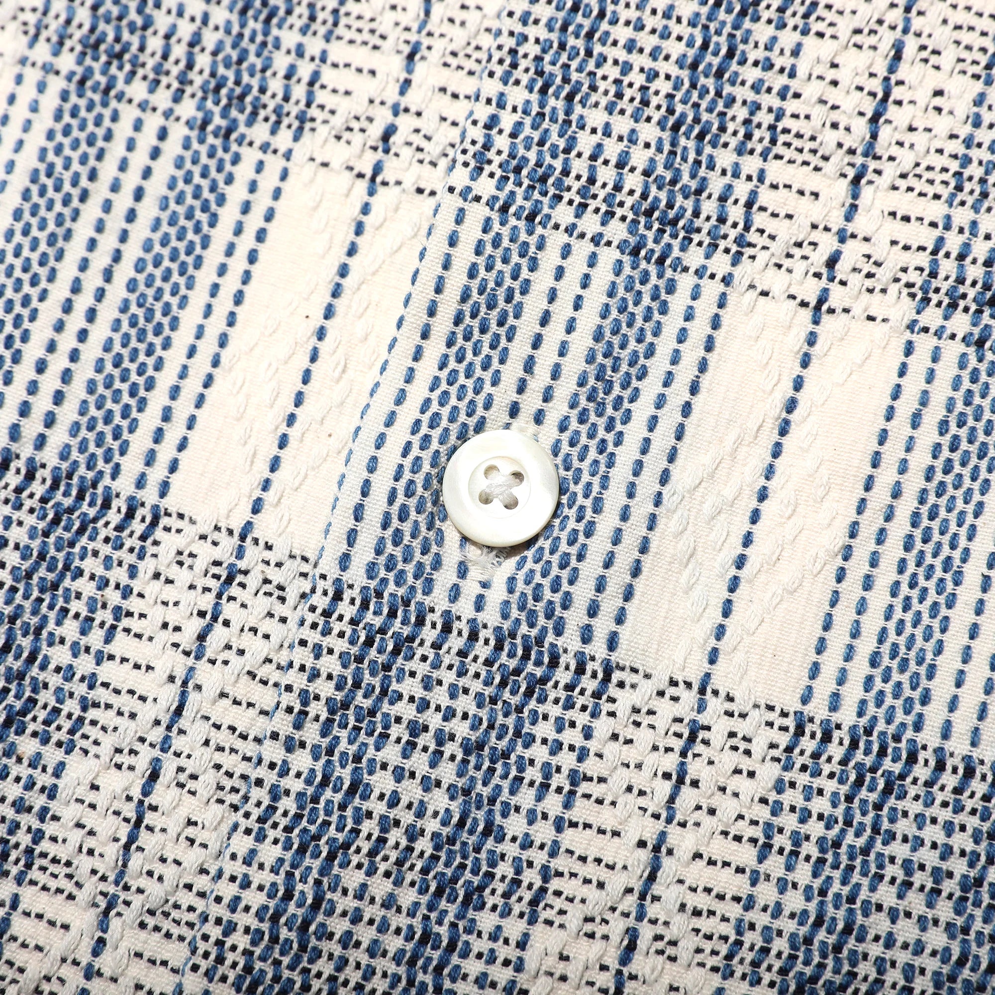 The JELADO Westcoast Shirt 刺子 is a modern take on traditional Japanese design. Made from a beautiful dobby weave fabric, this shirt features a vibrant asagi color inspired by nature and traditional clothing. The dobby weave mimics the intricate patterns of traditional sashiko stitching, resulting in a unique check pattern. This shirt pays homage to the 50's open collar style and incorporates a single pocket with no flap for a versatile look. Perfect for those looking to add a touch of Japanese tradition to their wardrobe.