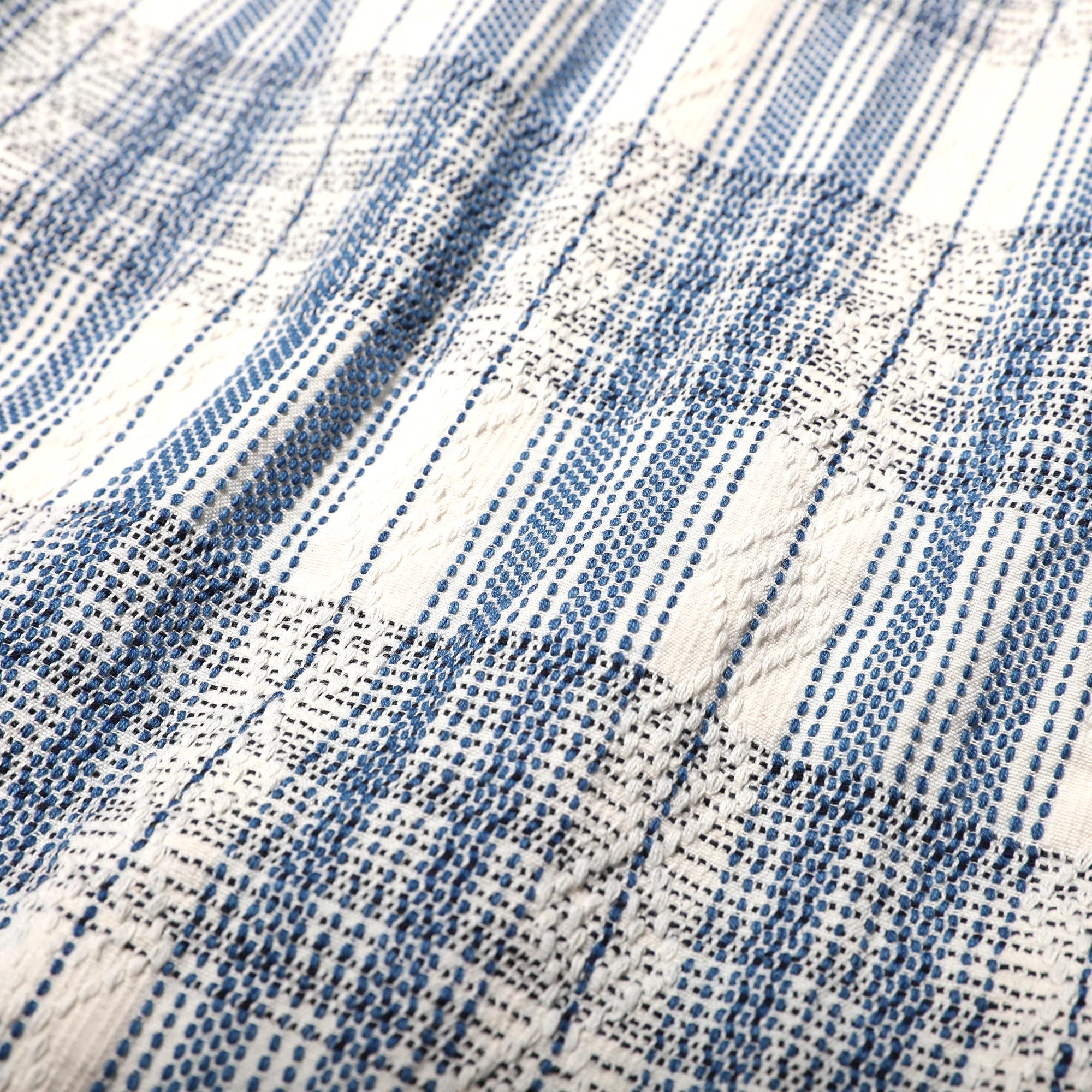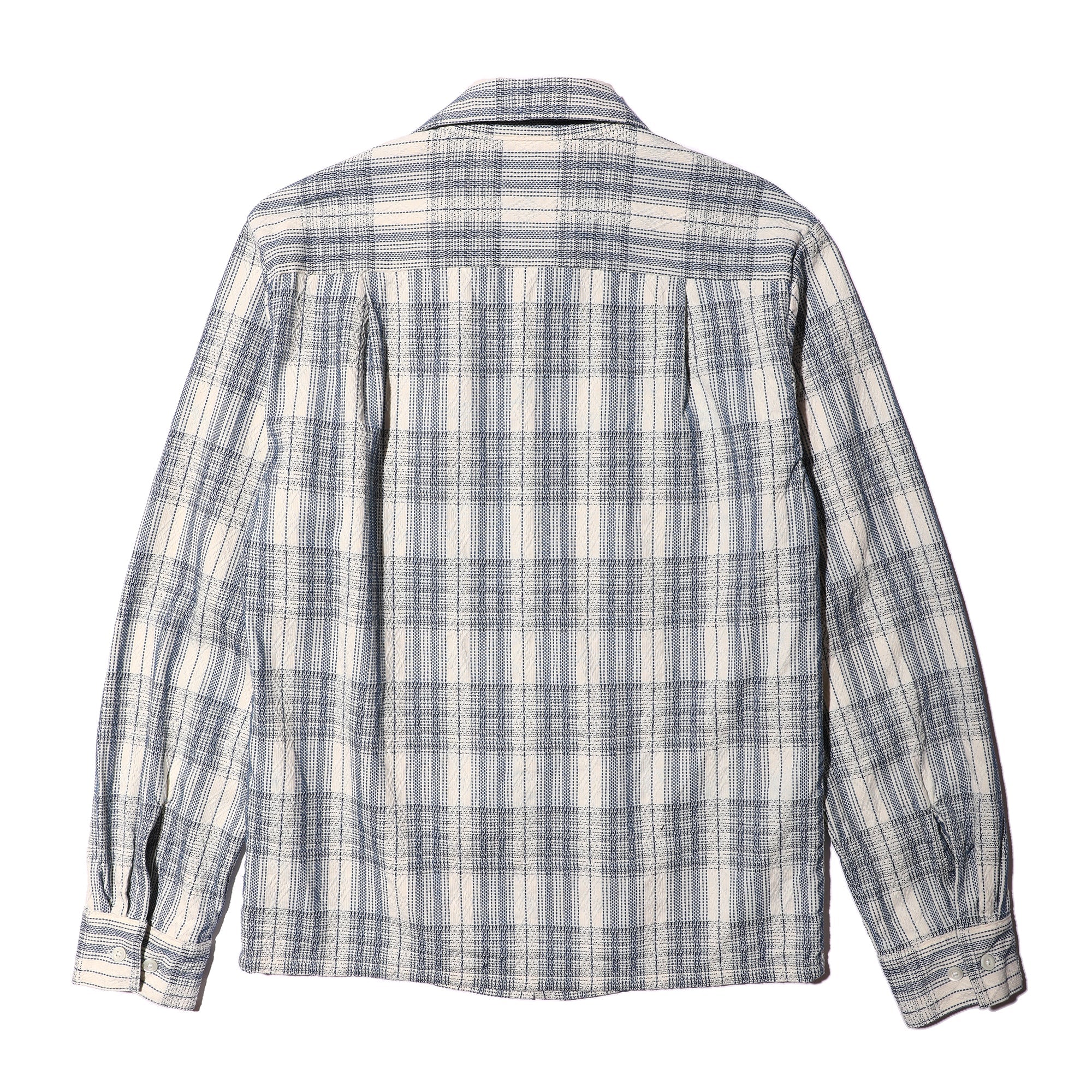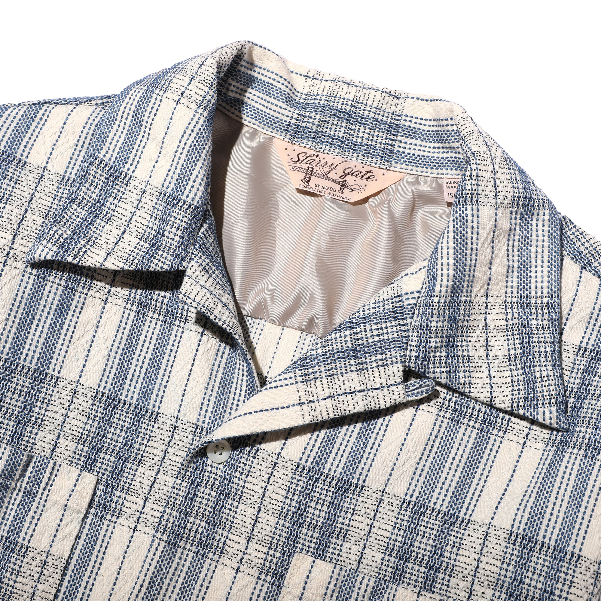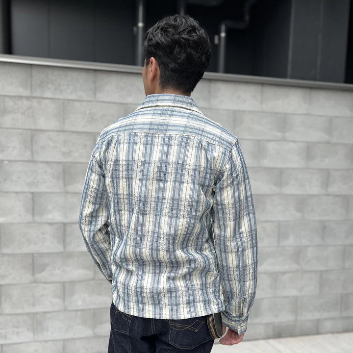 The JELADO Westcoast Shirt 刺子 is a modern take on traditional Japanese design. Made from a beautiful dobby weave fabric, this shirt features a vibrant asagi color inspired by nature and traditional clothing. The dobby weave mimics the intricate patterns of traditional sashiko stitching, resulting in a unique check pattern. This shirt pays homage to the 50's open collar style and incorporates a single pocket with no flap for a versatile look. Perfect for those looking to add a touch of Japanese tradition to their wardrobe.