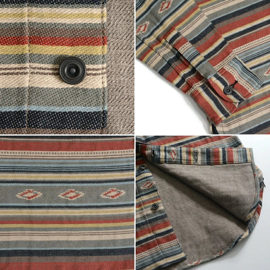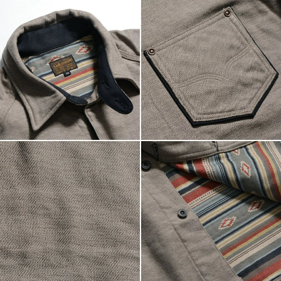 This DeluxeWare shirt showcases exceptional Japanese craftsmanship, featuring a three-layer woven heavy nel fabric entirely from 100% cotton. Manufactured in Nishiwaki, Hyogo Prefecture, the material combines 20/1 warp and 20/2 weft yarns with a double-woven base, creating distinctive multi-color patterns through intricate three-layer weaving. The result is a notably thick yet remarkably soft fabric with superior durability. Constructed in Odate, Akita Prefecture using a vintage 1960s Union Special triple-needle machine, this piece exemplifies traditional textile engineering and meticulous attention to detail. An investment in quality that reflects generations of Japanese weaving expertise.