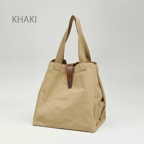 This Halftex Bucket bag from our Japanese-made Mainline collection looks like it has been crafted from a thick cotton canvas, however it is actually made from a special nylon, utilising special technology to halve the weight. With a wide bottom gusset, this bag has a large capacity and poppers at the side to open the bag up even more.