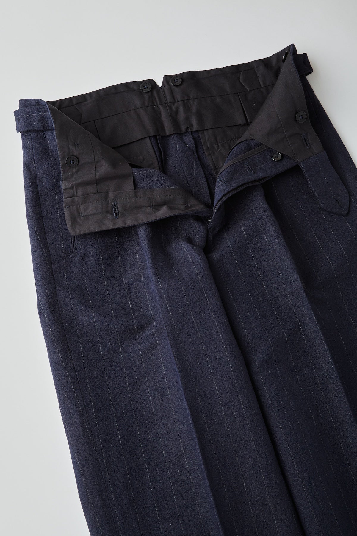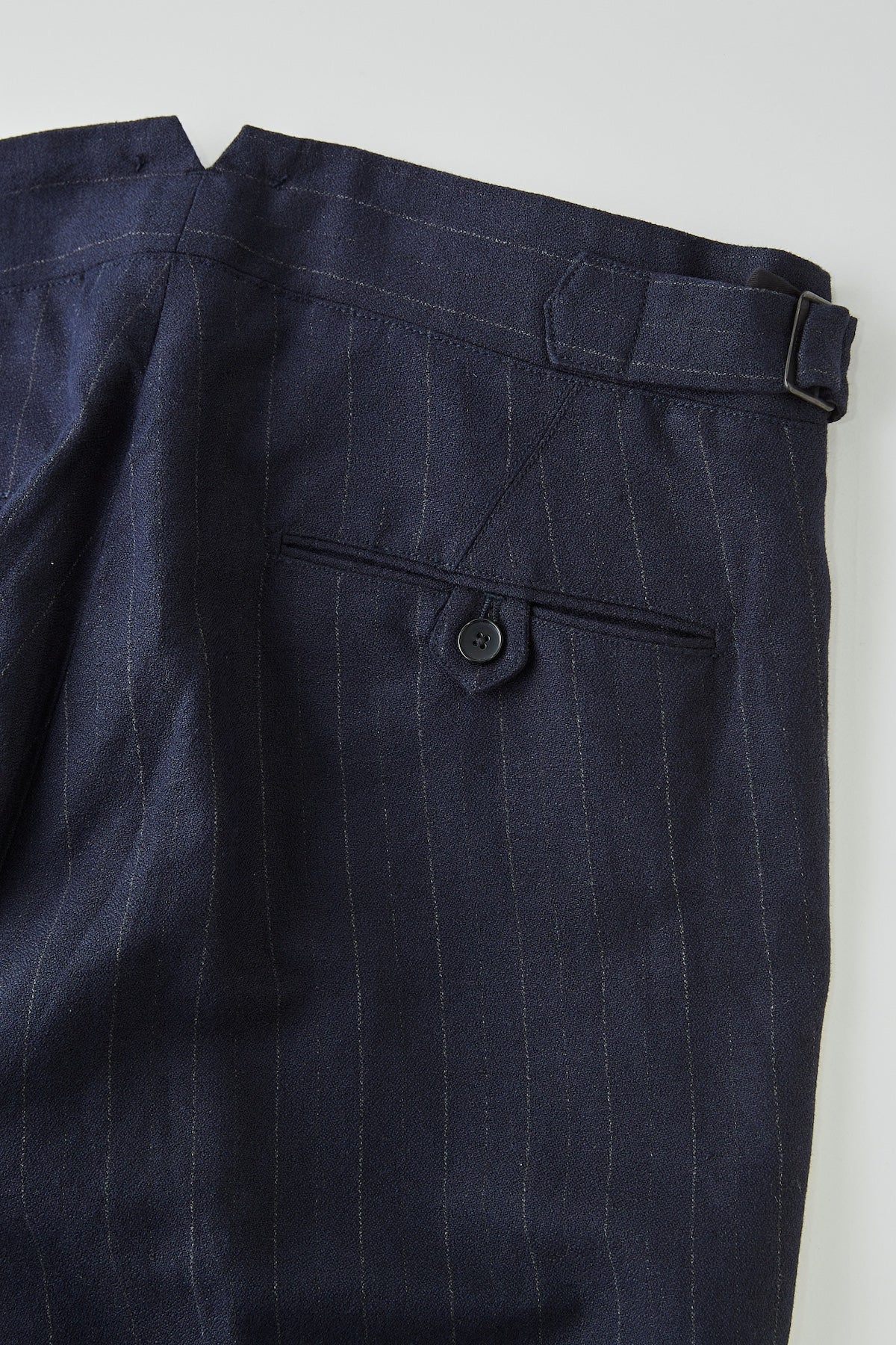Introducing the Old Joe DOUBLE-PLEATED SMARTY TROUSER, inspired by 1930's tailored trousers. With a higher waist, tapered fit, and signature details, it adds a classic touch to any outfit. Crafted with a cotton-linen blend, the "Amundsen" fabric features a subtle striped texture, while the "Silk Nep" fabric offers a casual yet refined look with its indigo-dyed threads and silk-like softness. Elevate your style with these versatile trousers.