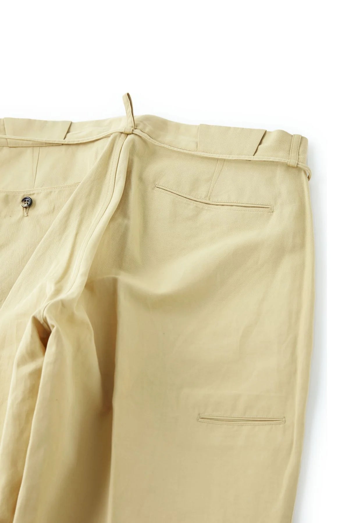 It features a thick tunnel belt loop that is typical of workers' uniforms. The relaxed tapered silhouette can be adjusted with a rope at the waist, giving it a relaxed look. The waist rope has a rope inside, so the more you use it, the more you will feel it. This season, the material is cotton linen natural slub twill. A set up with a duster coat and storm jacket will also liven up the atmosphere.