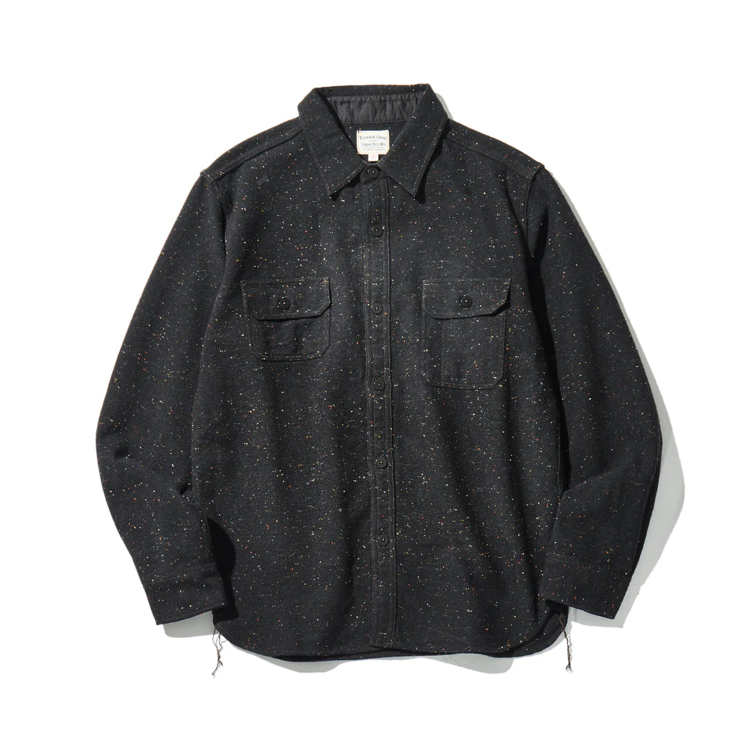 This is a work shirt with a "gacha poke" design that mixes work shirt-derived design features such as a deep back yoke and elbow patches, while incorporating a balance of details based on a hunting jacket design from the 1950s.