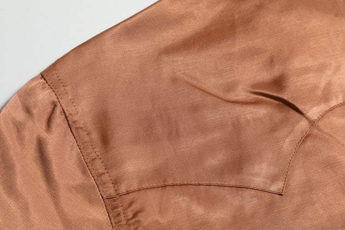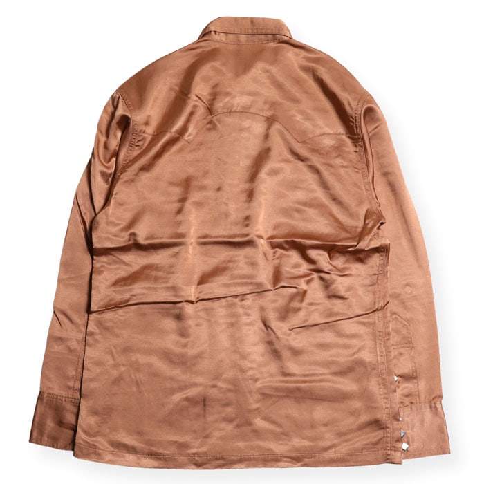 A new work that arranges Western, which is attracting increasing attention in the VINTAGE market, into a BOX-shaped silhouette. The fabric uses rayon cotton satin material with the unique lustre and drape of filament rayon. While adopting details unique to western shirts such as tetra snaps and yamakiri flap pockets, it is finished with a work shirt cut, and a western yoke is at the back. Another point is that it is easy to match with a variety of coordination because of the BOX silhouette. Simple chain embroidery is applied to both chests instead of prints, and it is a piece reminiscent of the formal wear of the WR specialised tuner "MR WR". It will be a dress that will also be active as a dress code for a small party.