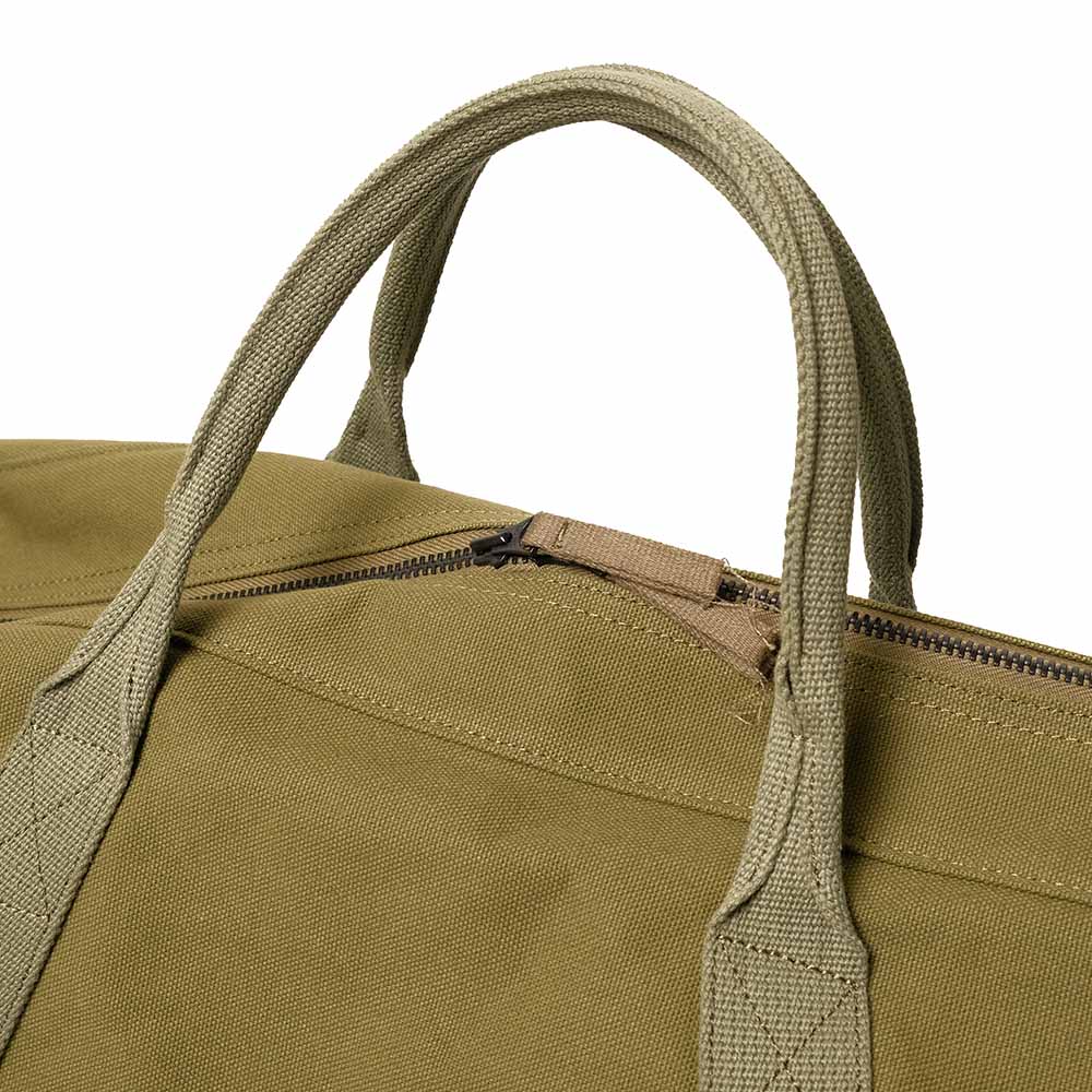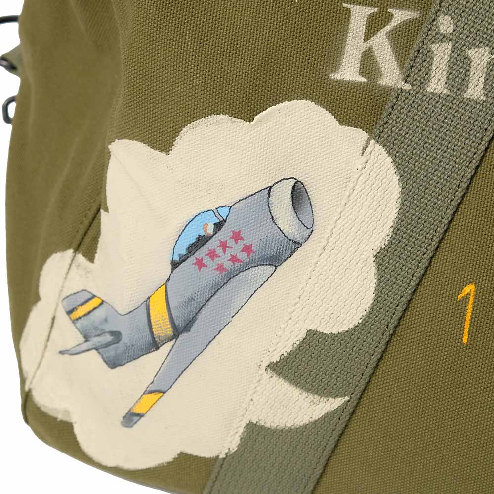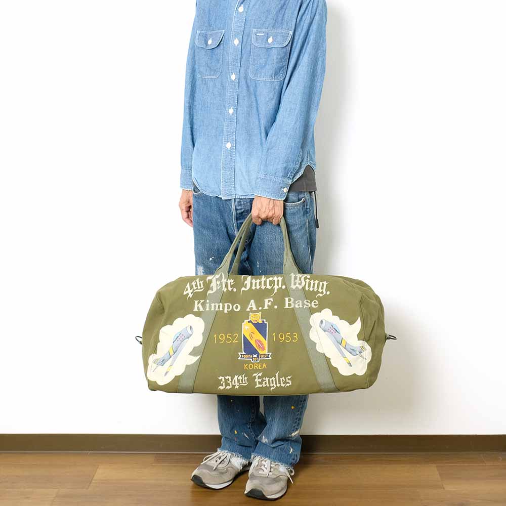 - "Buzz Rickson's" has reproduced a kit bag with hand-painted military designs, based on vintage military bags. The kit bag, used by pilots to carry all necessary personal equipment when boarding a fighter jet, is made from thick canvas for strength. Its capacity to hold helmets and other gear increases its weight, necessitating the use of durable materials. The bag's interior features comprehensive piping for added strength. Although shoulder straps are not standard, a detachable strap is included for ease of use. The presence of the Air Force mark, transferred onto the bag similarly to flight jackets until 1962, underscores its vintage value.