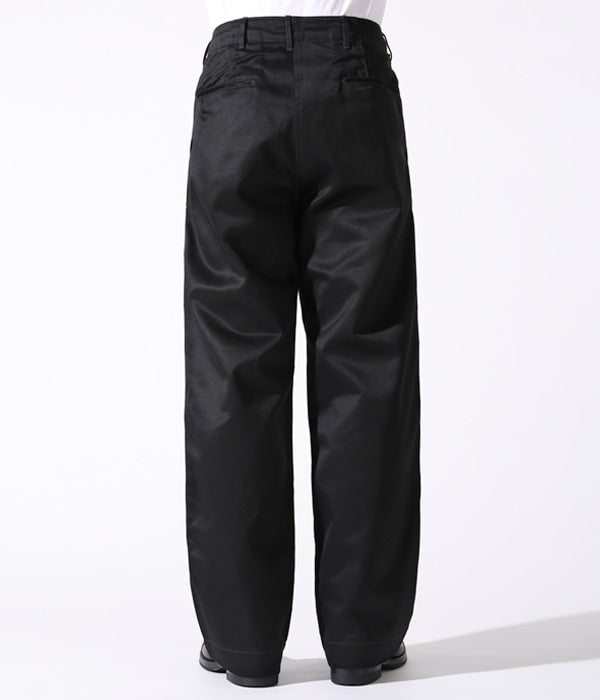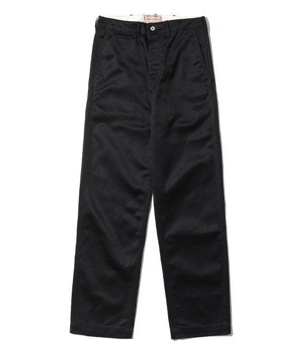 Black version of the chino trousers adopted by the Army in 1942. Due to its high density the fabric has a beautiful luster, and its wide-leg silhouette goes well with jackets of the good old days.