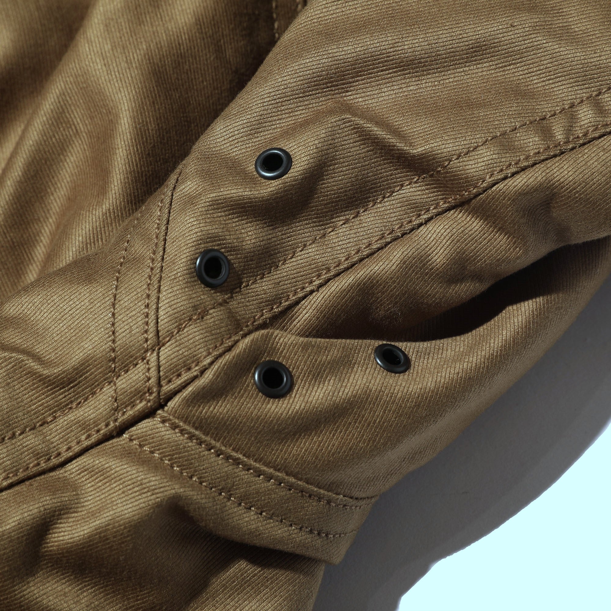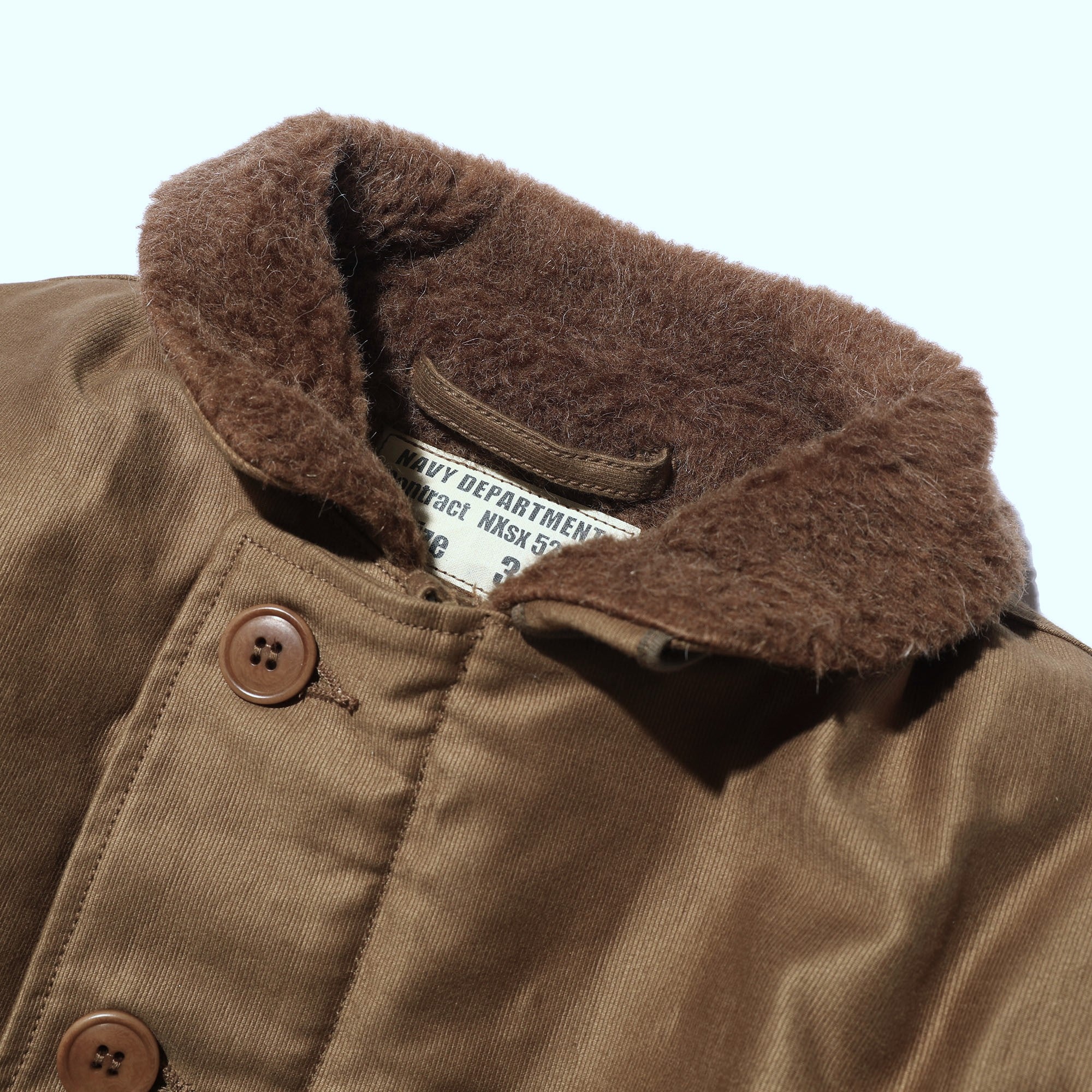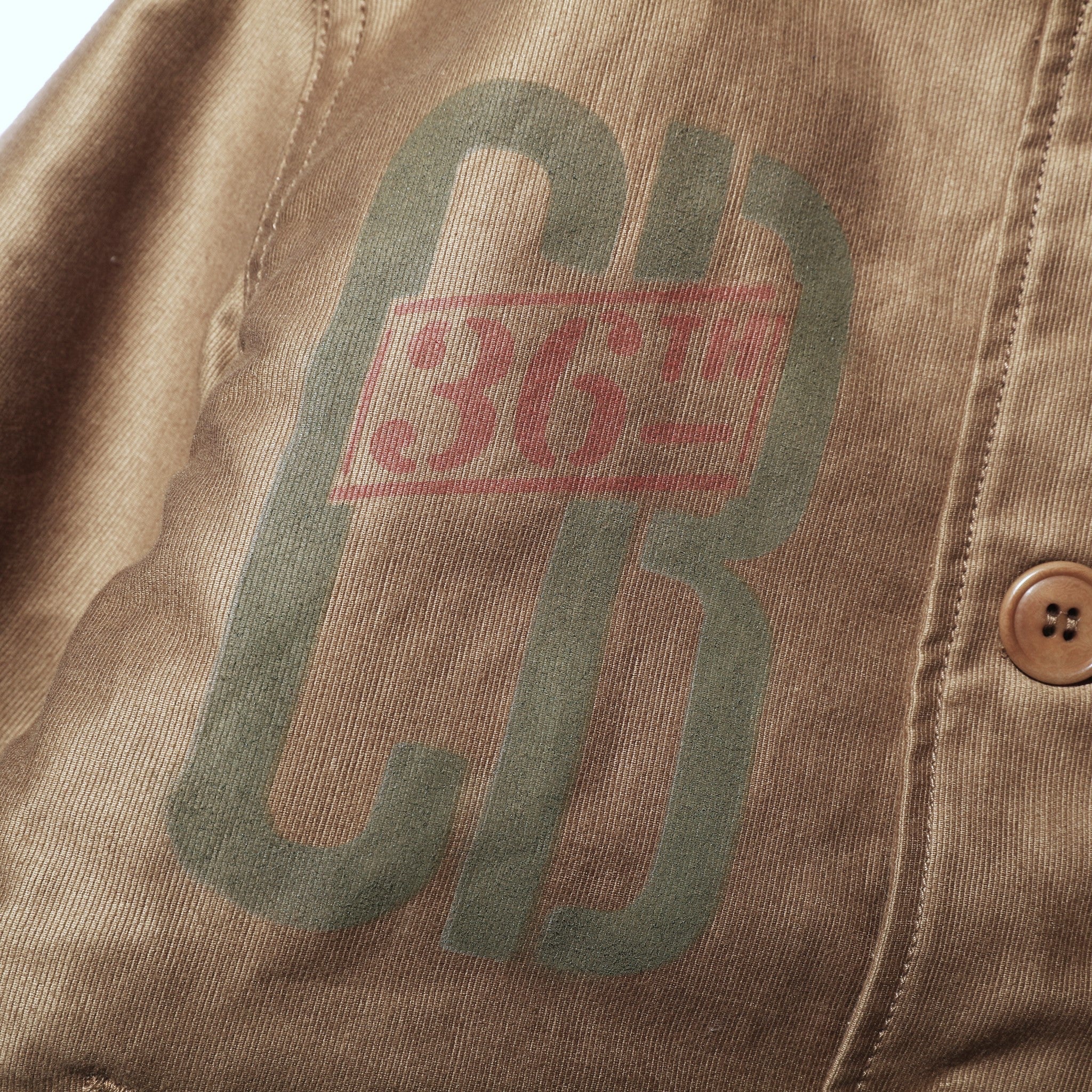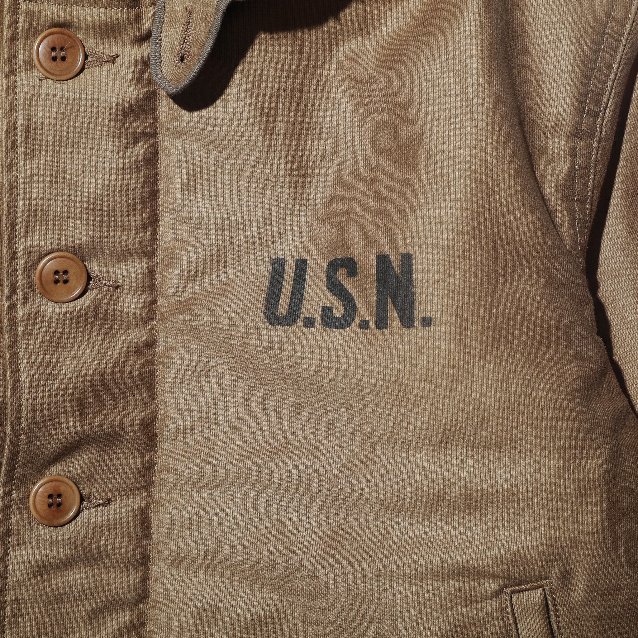 Get a piece of history with our COLIMBO OBSERVER JKT ♯N-1 Khaki-1st. Custom jacket. Modeled after the original deck jacket produced for the US Navy and Marines in the late stages of WWII, it was later embraced by motor sport enthusiasts. Made from 100% cotton grosgrain, with a soft alpaca lining. Features a combination of buttons and TALON zippers, with a drawstring waist for adjustments. In honor of the Sea Bees- the skilled construction team who helped build airfields and bridges during the war- the jacket is adorned with a bee motif. Stay warm and stylish in this piece of authentic military fashion.
