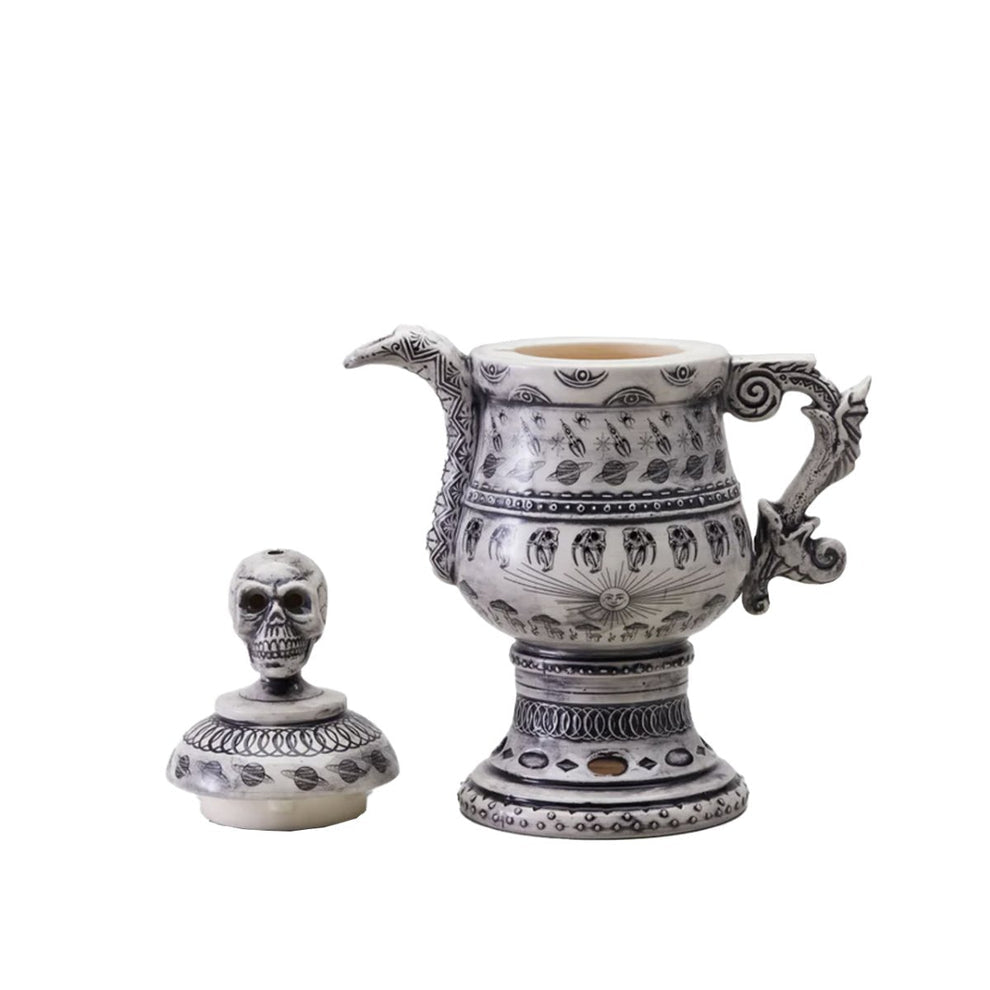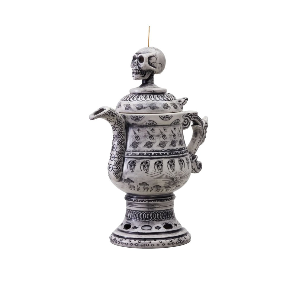 Ceramic incense chamber decorated with detailed drawing graphics. The form is inspired by an oil lamp with a large skull placed on top. A collaboration model with tattoo artist Dr. Woo.