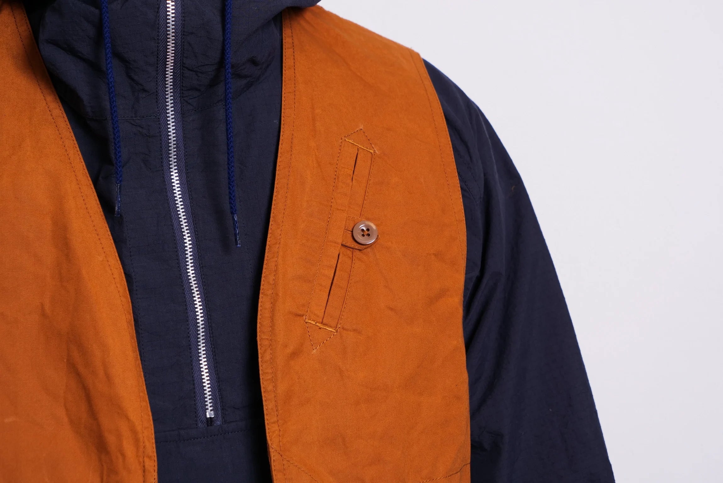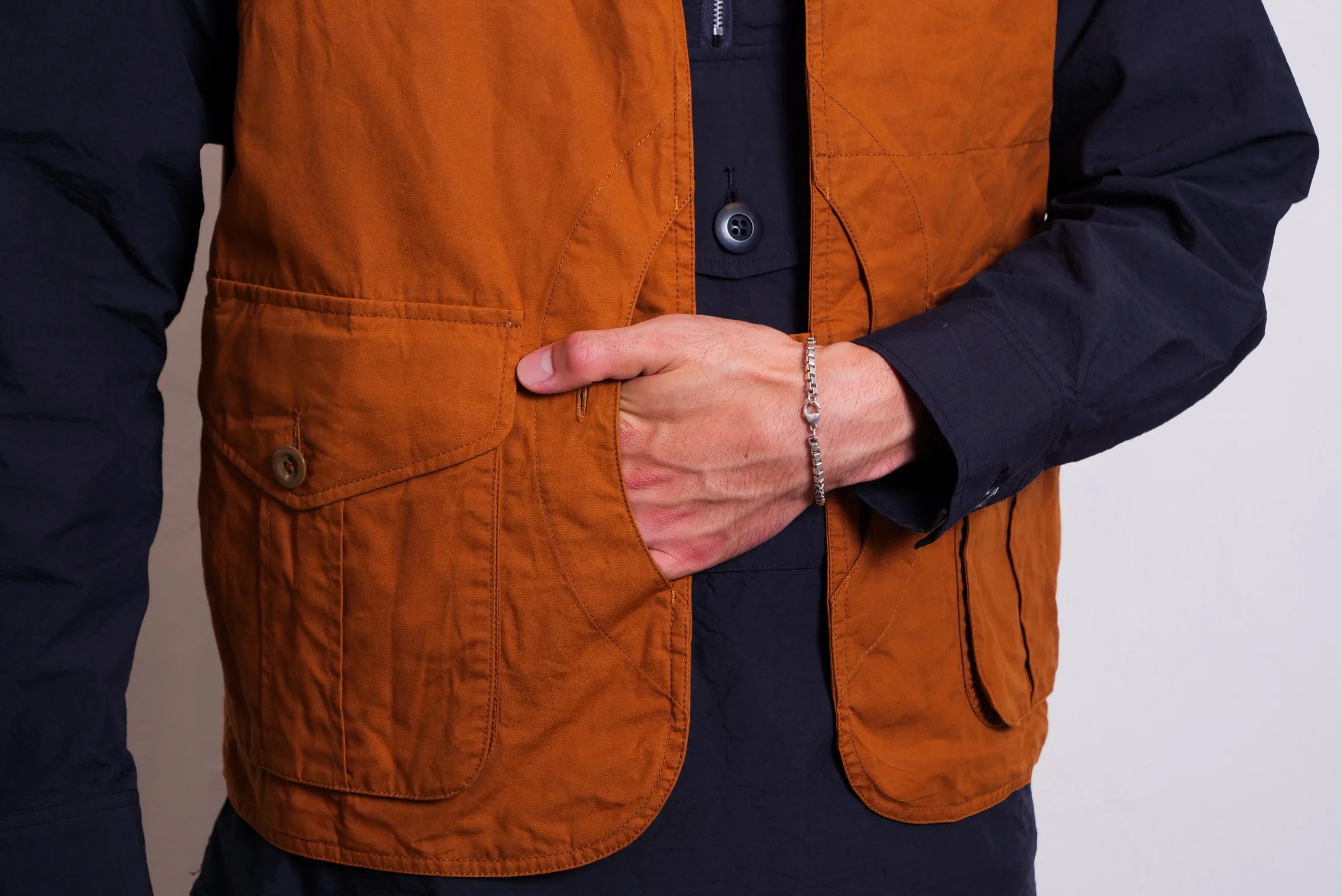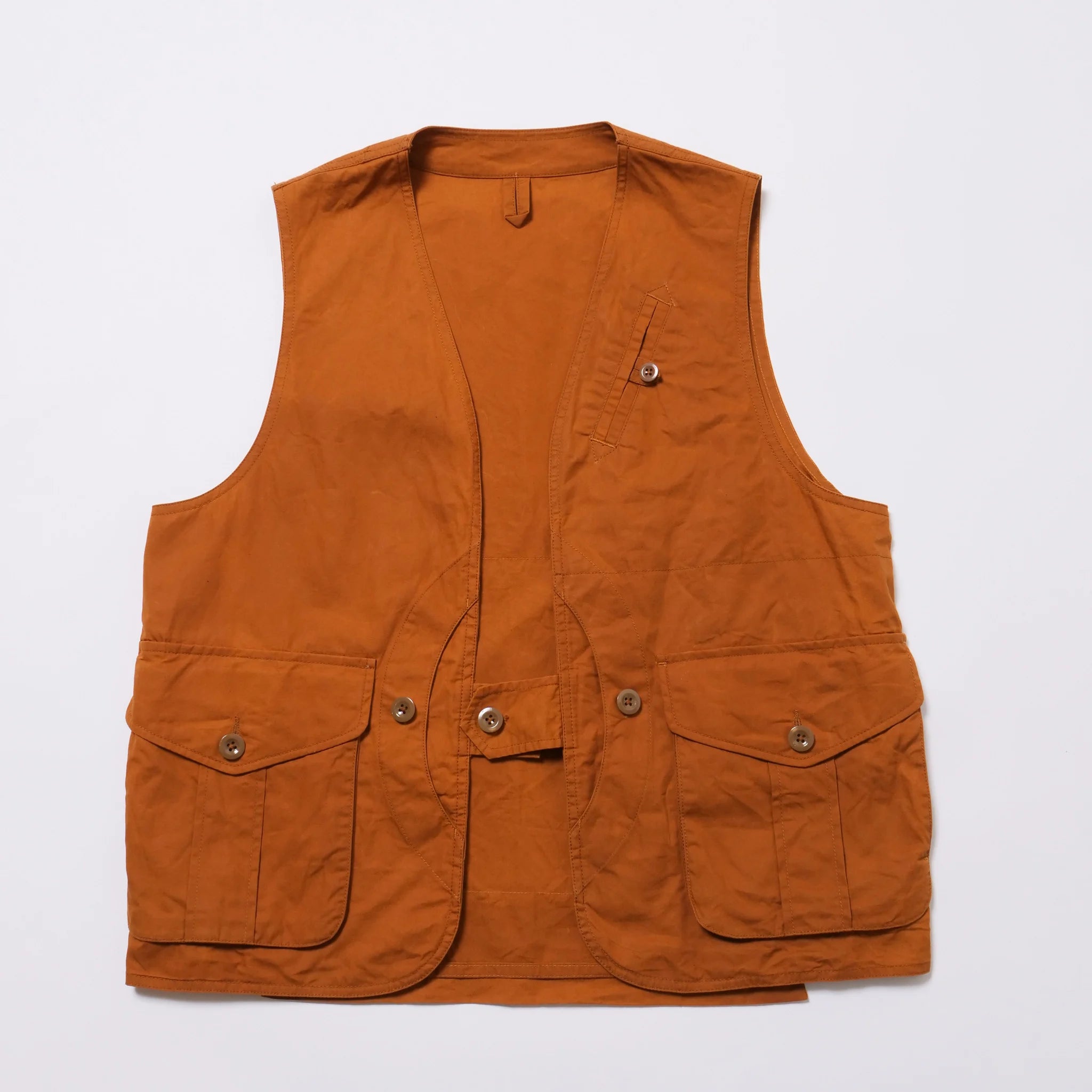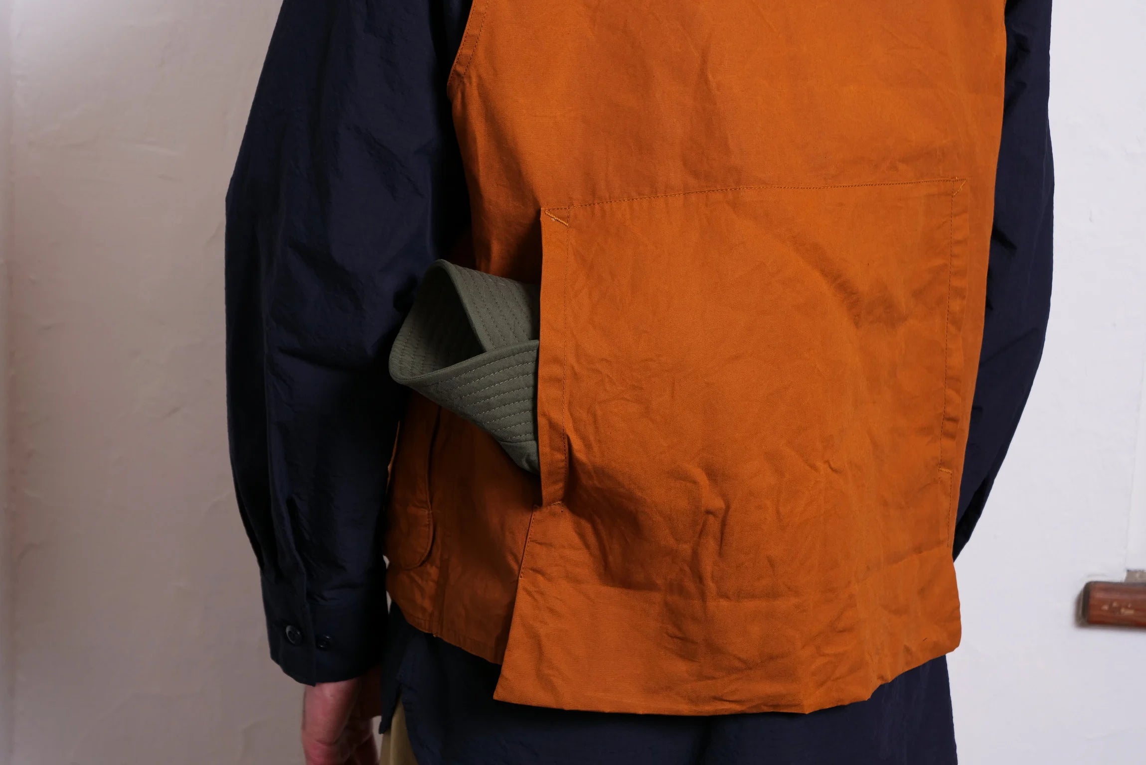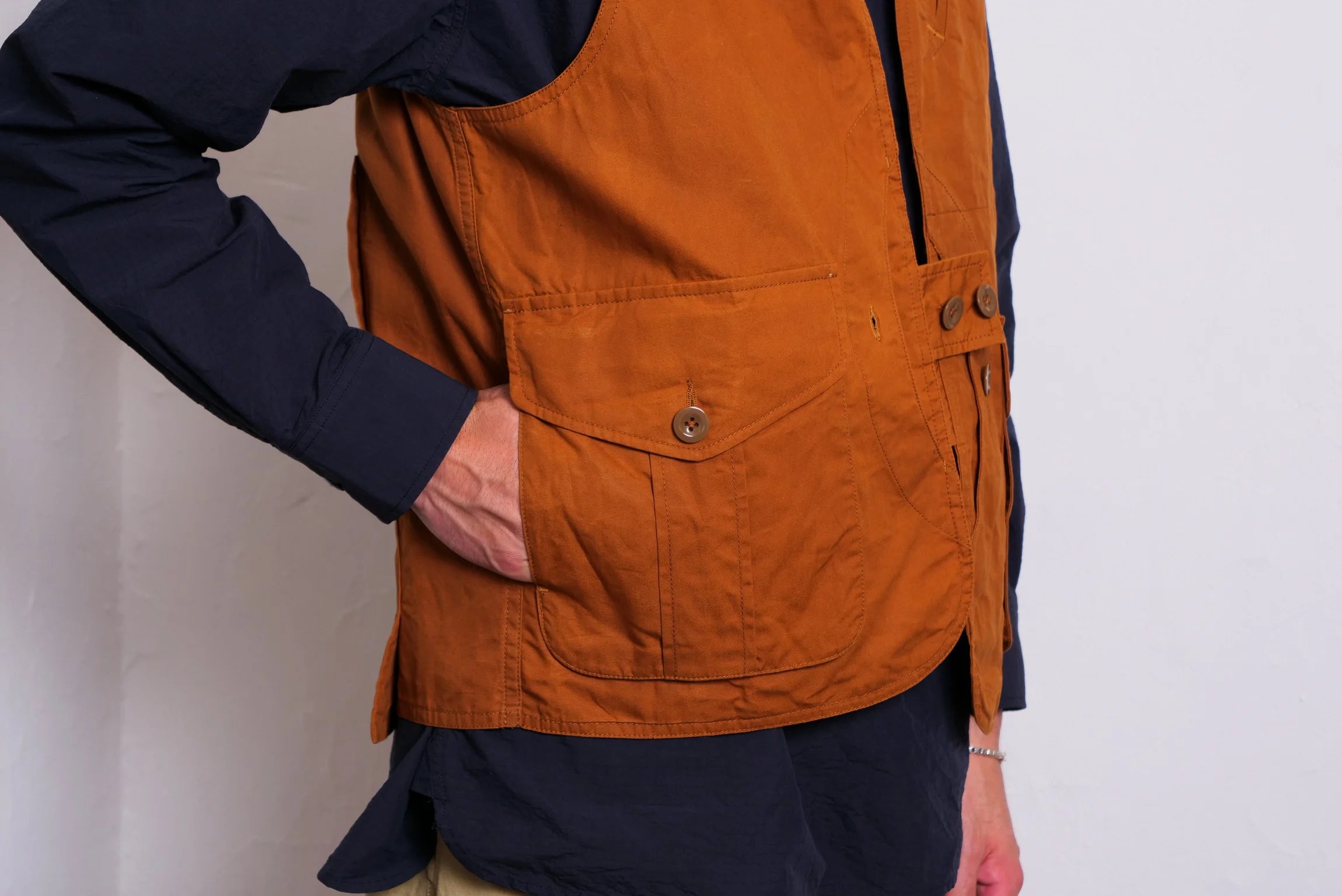 The soundman Hunter (ハンター) 873M-407X Brick C/#56 is a 60s inspired American hunting vest design with functional pockets including a game pocket, hand warmer pocket, and buttoned chest pockets. Made with high density cotton canvas and paraffin coating for increased water resistance. Embrace the unique markings and chalk marks as they add to the charm, and easily wash them away.