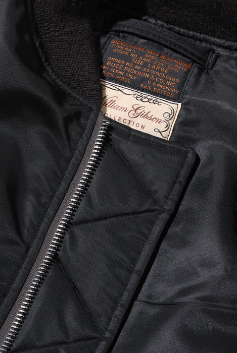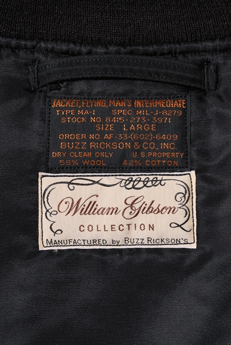 WILLIAM GIBSON COLLECTIONEarly in 2003, best-selling novelist William Gibson released a groundbreaking new book, “PATTERN RECOGNITION”. This absorbing and masterfully crafted novel is set in the period immediately following “9-11”, featuring a high-tech., super-hip, cyber-chic, anti-fashion sophisticate, Cayce Pollard, as the heroine. Brilliantly woven within the many pages of cutting-edge prose Mr. Gibson has crafted is the one object more valued by Cayce Pollard than any other her Black Buzz Rickson’s MA-1 Flying Jacket. William Gibson is an author of superior talent and exceptional good taste. Vintage clothing represents an area of personal interest to him, especially wristwatches, US flying jackets and jeans. He is a great admirer of the goods produced by Buzz Rickson’s, which is what provided the inspiration for the fictionalized Buzz Rickson’s black MA-1 jacket worn by his central character, Cayce Pollard, in his novel. In the course of writing his novel, Mr.Gibson was aware that no MA-1 jackets were ever produced for the USAF in black but he decided to make the color of Cayce's jacket black, not Sage Green, which is the original color of the MA-1,because Cayce's jacket needed to be black in the creative vision of Mr.Gibson. Today, Buzz Rickson's is proud to introduce the all new William Gibson Collection of Classic Military Jacket Styles produced exclusively in BLACK.